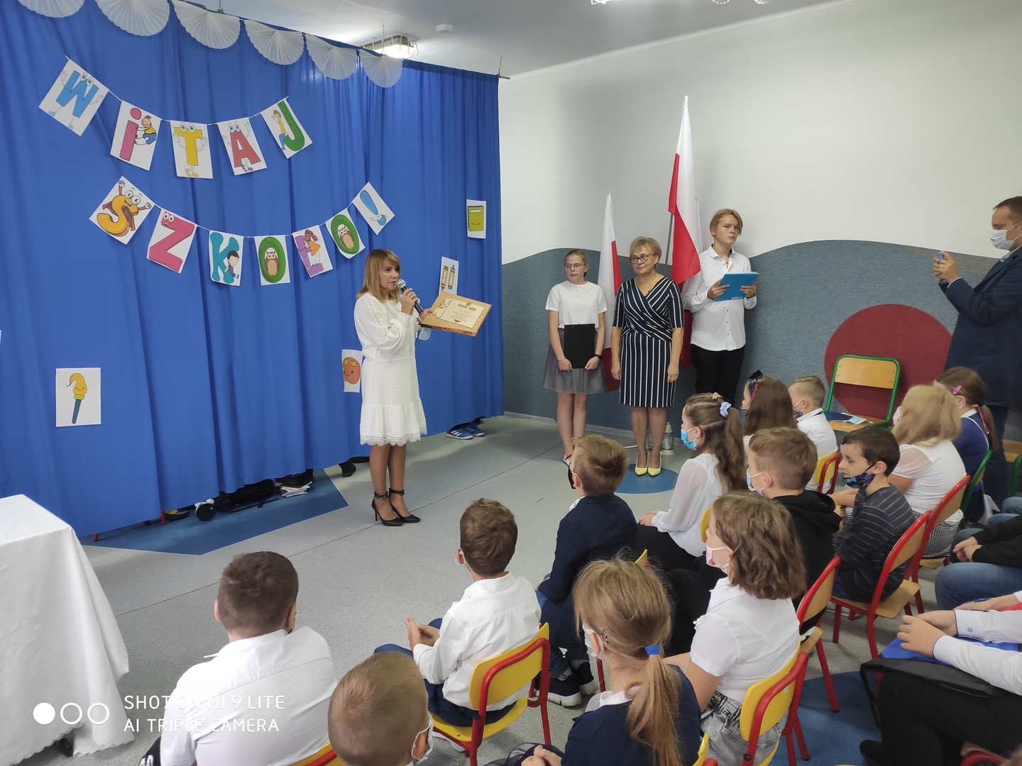 Inaugurację oficjalnie rozpoczęła Pani Dyrektor Mariola Kuliś, witając Wszystkich dobrym słowem i przekazując istotne informacje. Ogromnym wyróżnieniem było odebranie z rąk Pani Burmistrz statuetki Sowy - lauru za najlepsze wyniki egzaminu ósmoklasisty.
