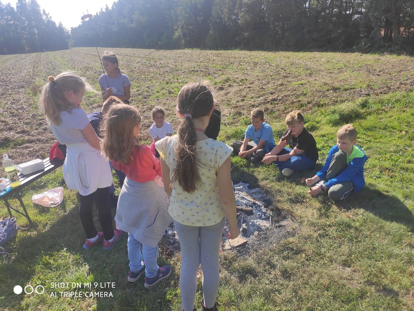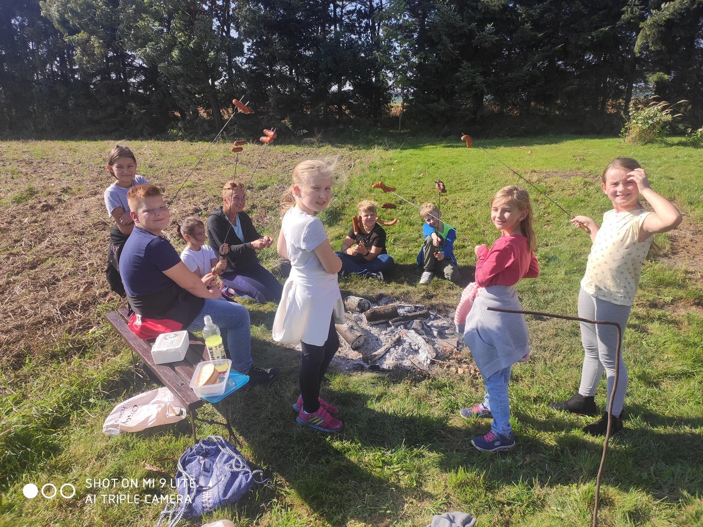 Zajadaliśmy upieczone nad ogniskiem kiełbaski. Dla wielbicieli słodkości czekały przepyszne winogrona i maliny- prawdziwa uczta!