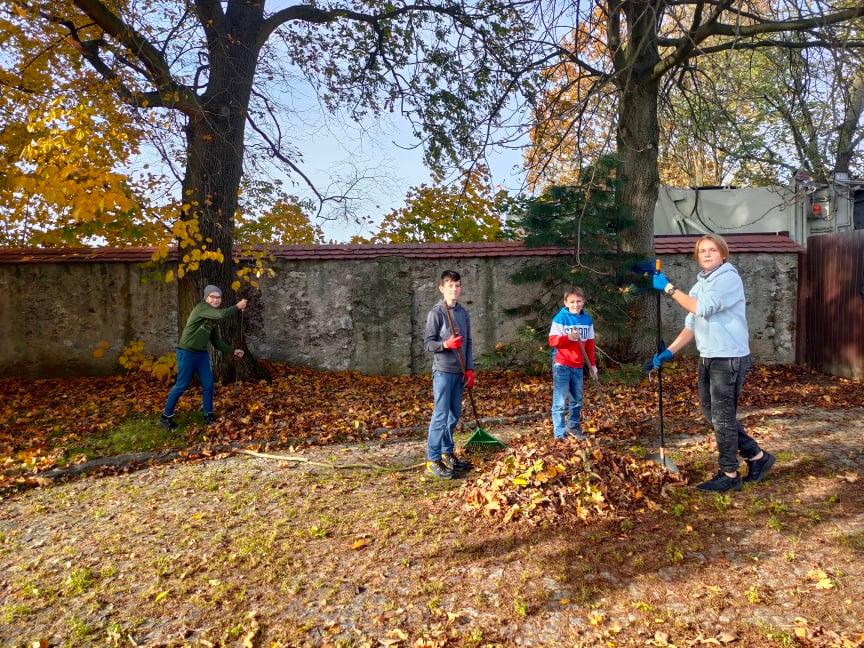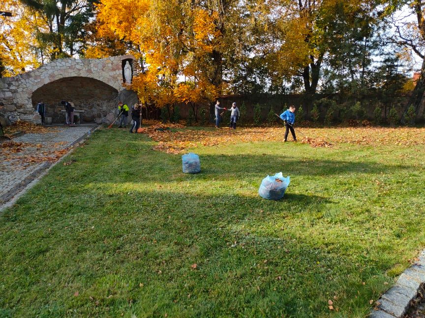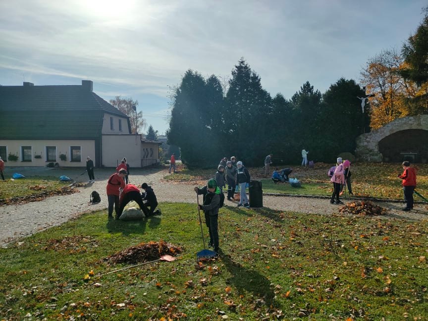 Wszyscy uczestnicy z ogromnym zapałem zabrali się do grabienia, zamiatania oraz wywożenia zbędnych liści z terenu probostwa, czemu towarzyszyła fantastyczna atmosfera i piękna pogoda.