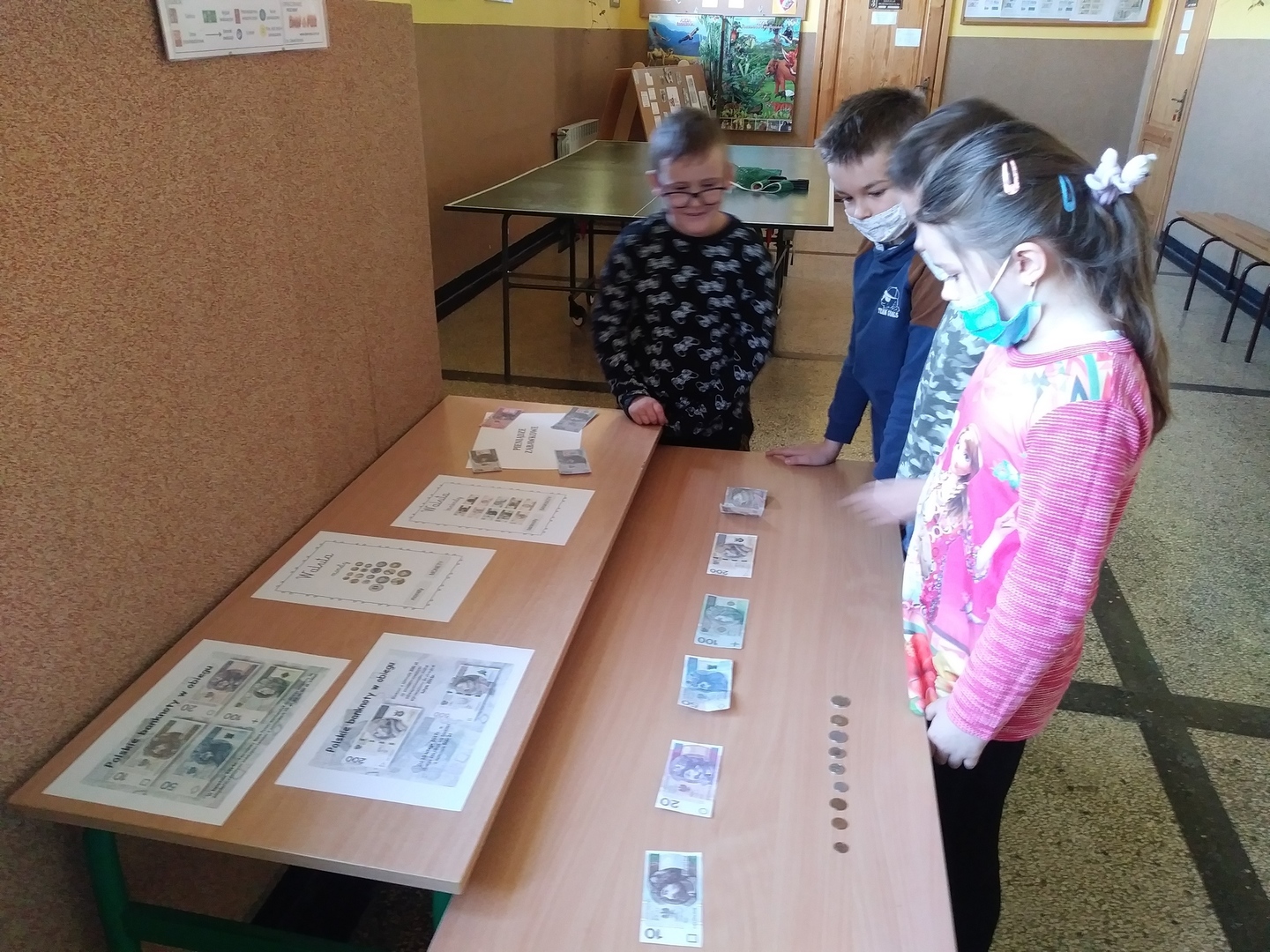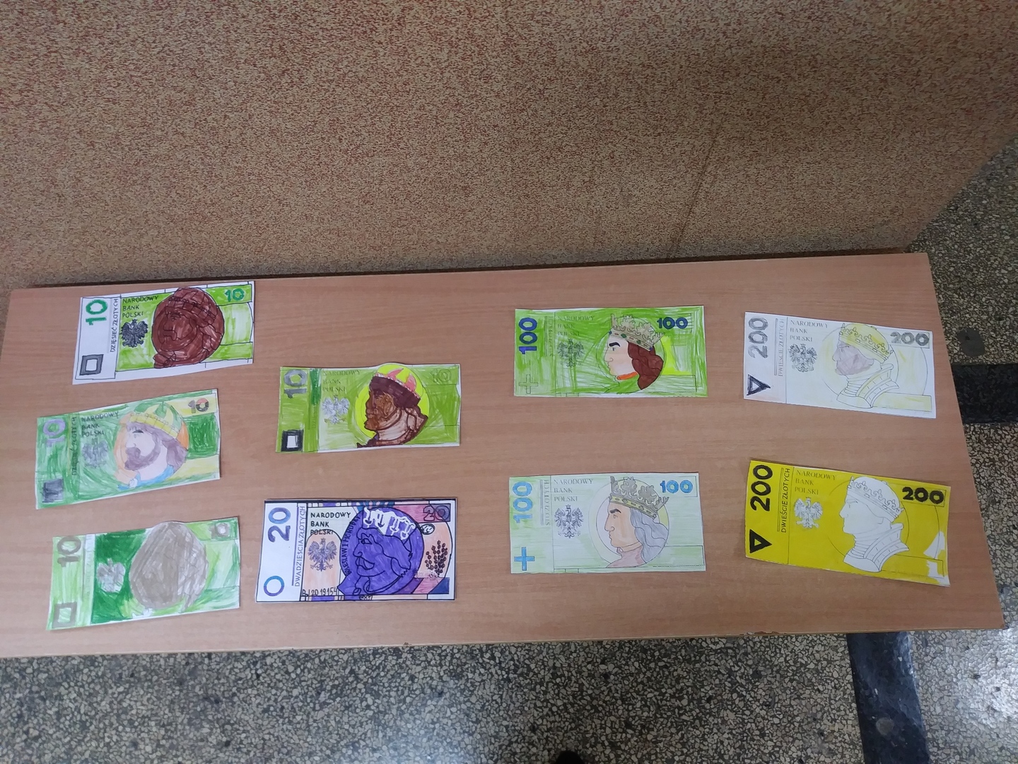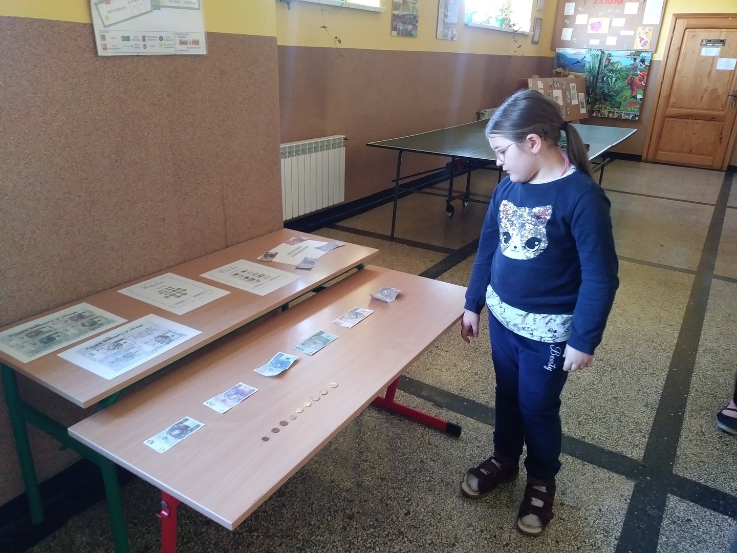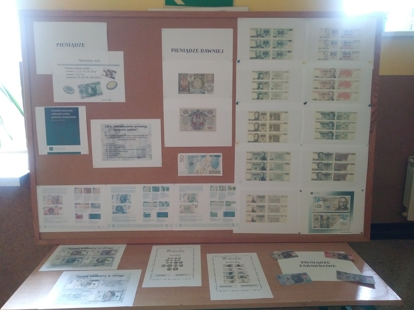 W naszej szkoła została przygotowana wystawa na temat polskich banknotów. Uczniowie klas młodszych mieli okazję zapoznać się z wystawą, obejrzeć, jakie obowiązywały dawniej pieniądze, a jakie obowiązują dziś. Przeprowadzono również krótką pogadankę na powyższe tematy. W celu sprawdzenia swojej wiedzy na temat pieniądza każdy uczeń klas młodszych pokolorował wybrany banknot kolorowankę. Dwie uczennice klasy piątej przygotowały plakat zawierający informacje: czym jest Narodowy Bank Polski, co to jest obrót pieniężny, transakcje bezgotówkowe, płatności gotówkowe.