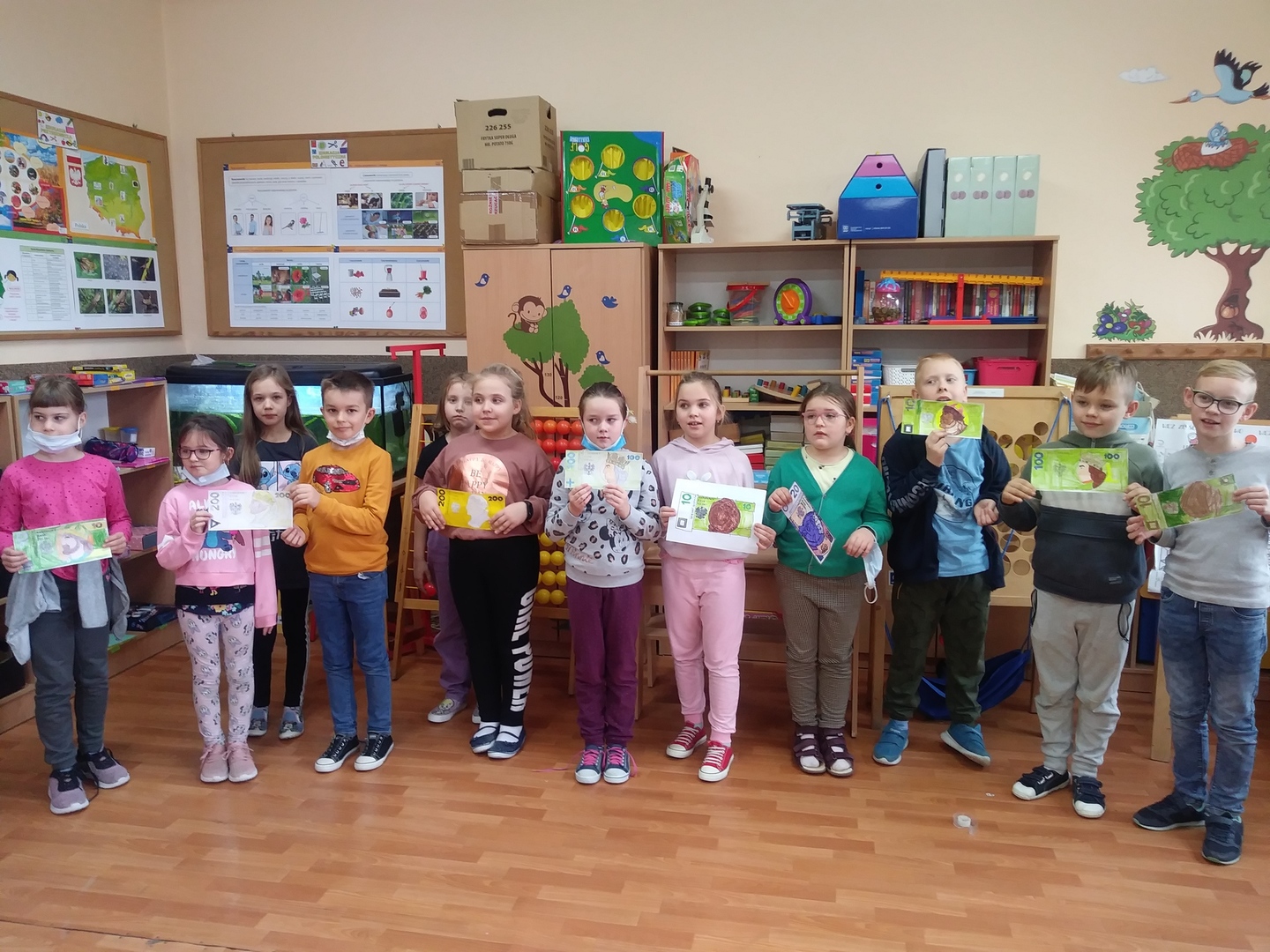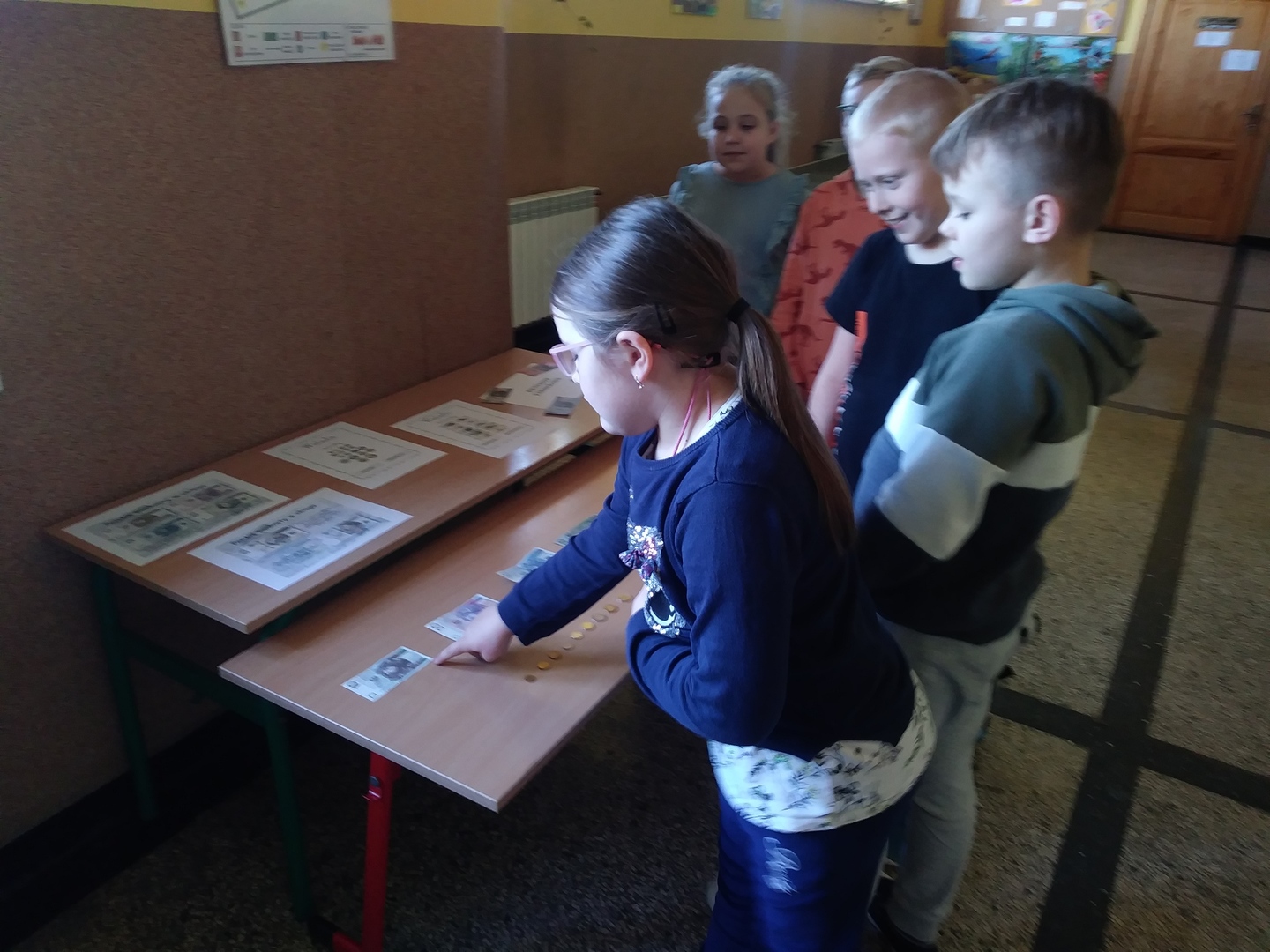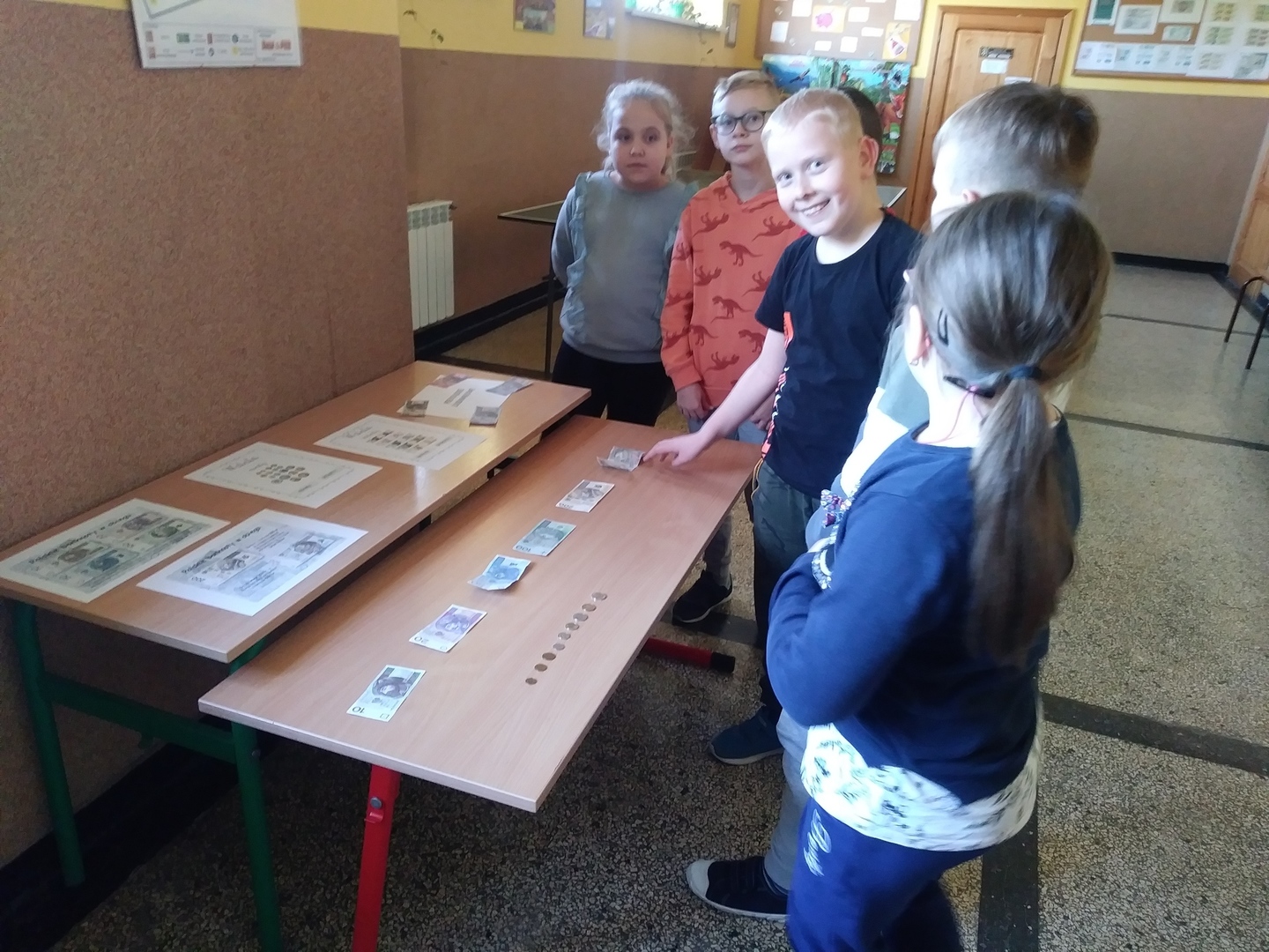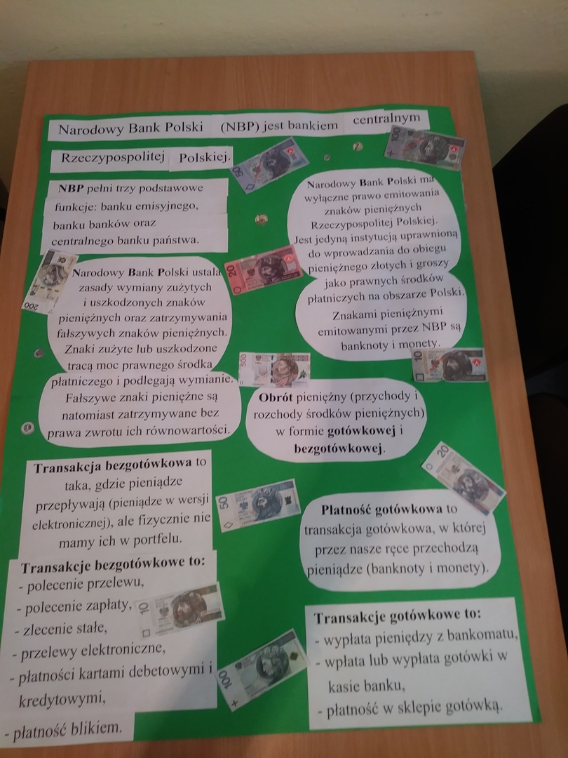 W naszej szkoła została przygotowana wystawa na temat polskich banknotów. Uczniowie klas młodszych mieli okazję zapoznać się z wystawą, obejrzeć, jakie obowiązywały dawniej pieniądze, a jakie obowiązują dziś. Przeprowadzono również krótką pogadankę na powyższe tematy. W celu sprawdzenia swojej wiedzy na temat pieniądza każdy uczeń klas młodszych pokolorował wybrany banknot kolorowankę. Dwie uczennice klasy piątej przygotowały plakat zawierający informacje: czym jest Narodowy Bank Polski, co to jest obrót pieniężny, transakcje bezgotówkowe, płatności gotówkowe.