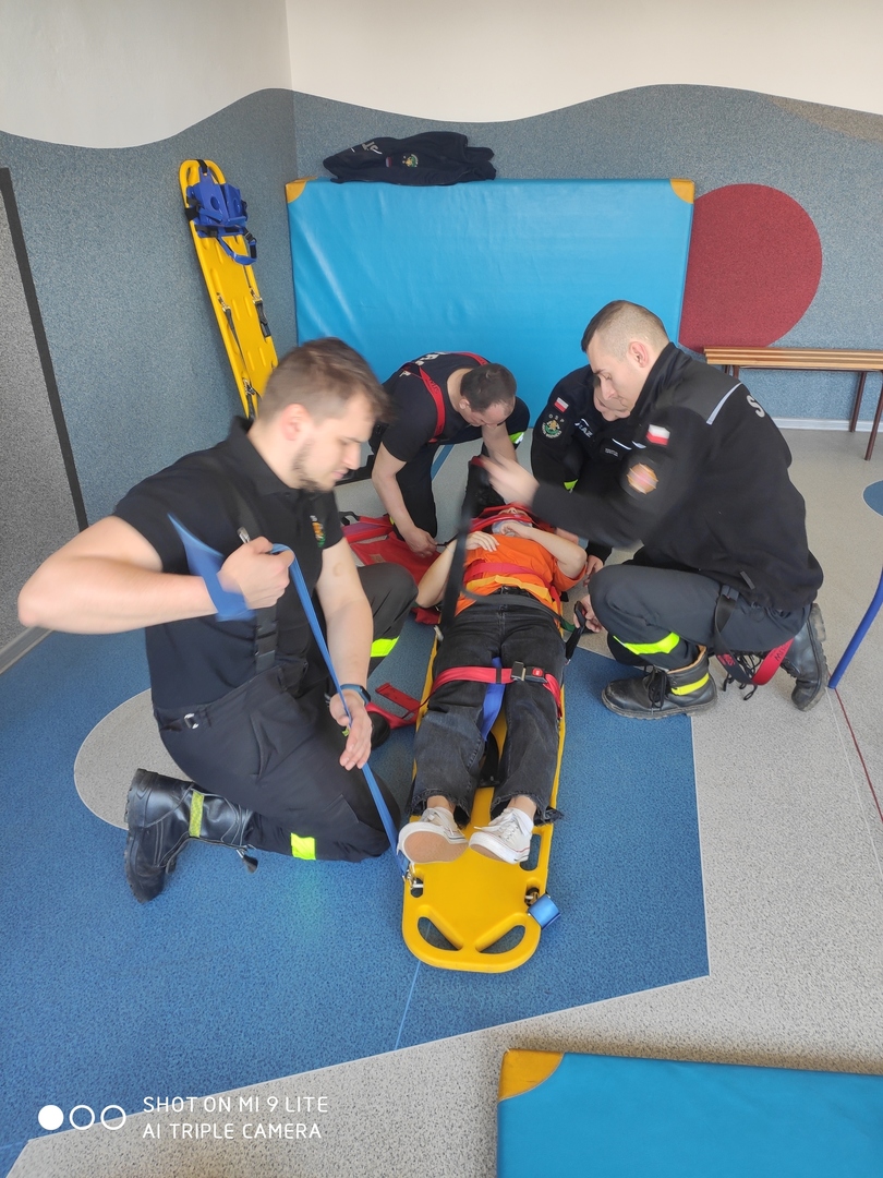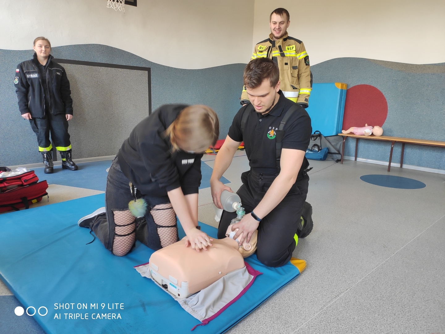 Po zakończonej ewakuacji strażacy przeprowadzili zajęcia z udzielania pierwszej pomocy dla uczniów wszystkich klas.