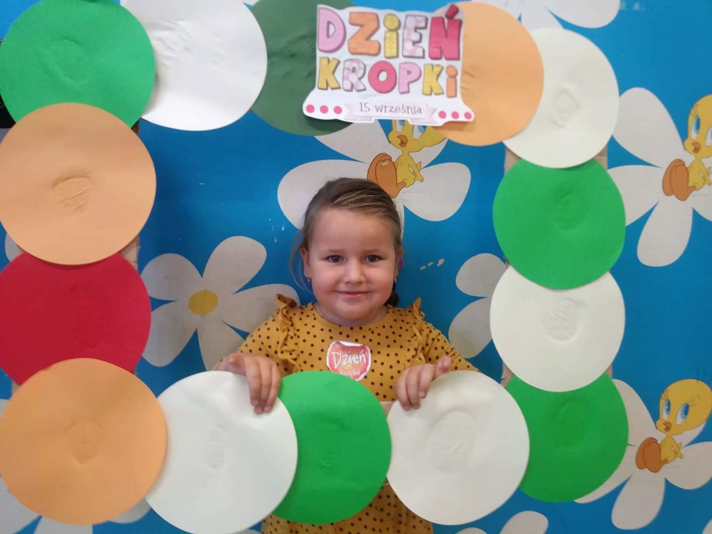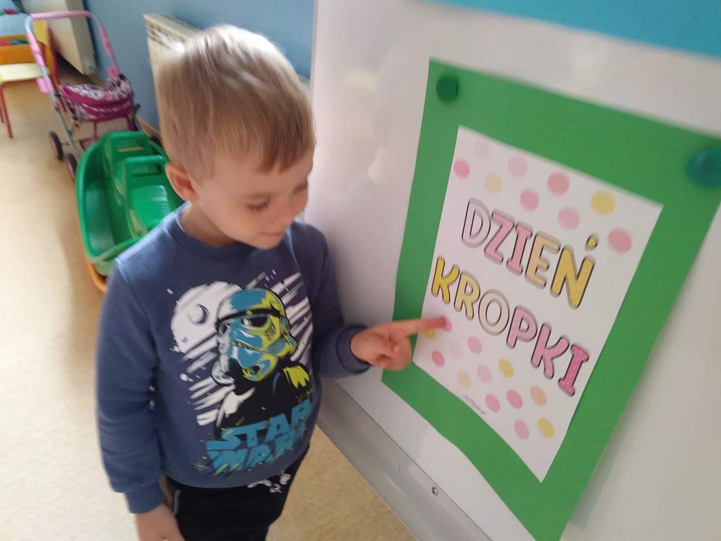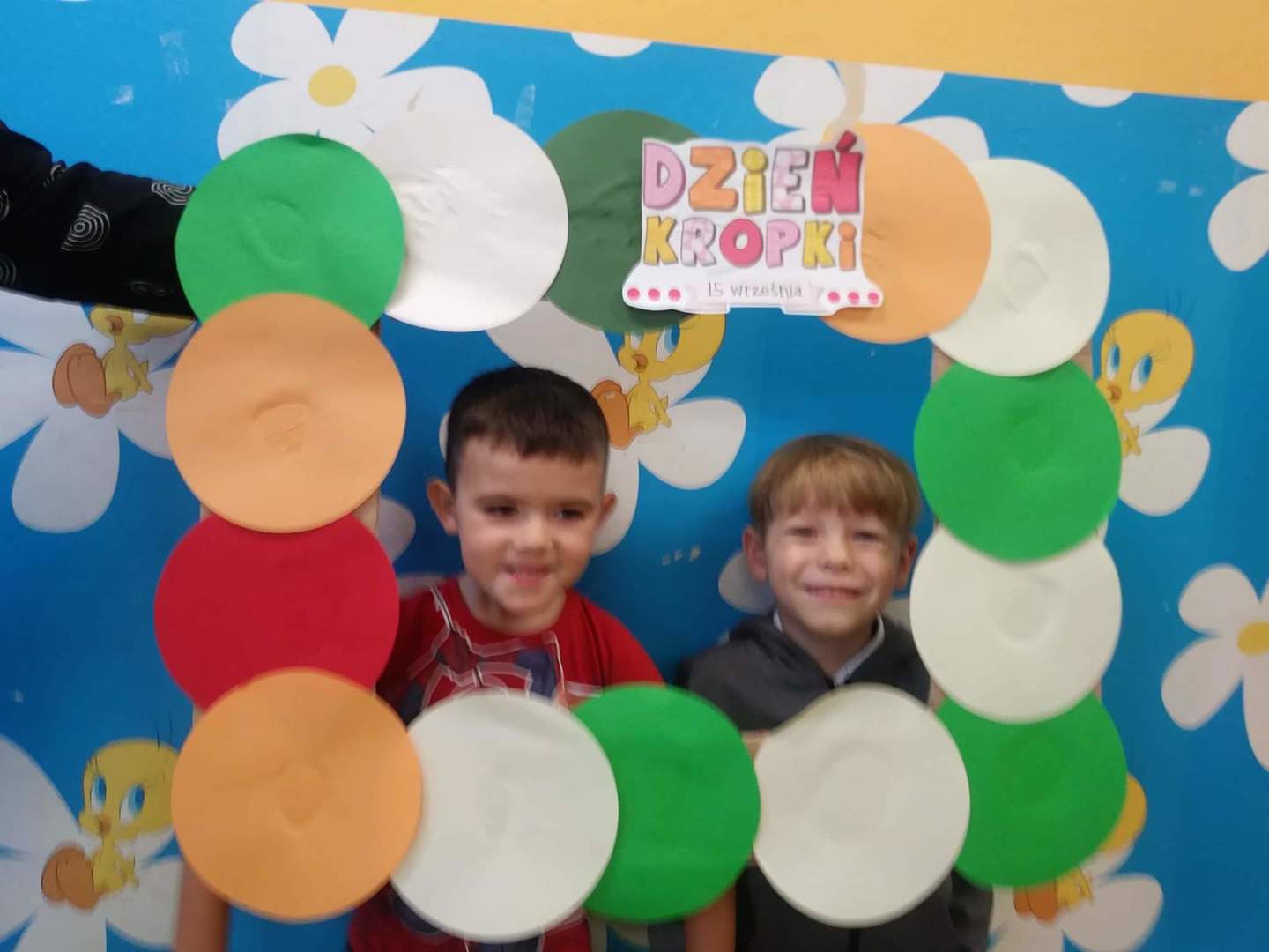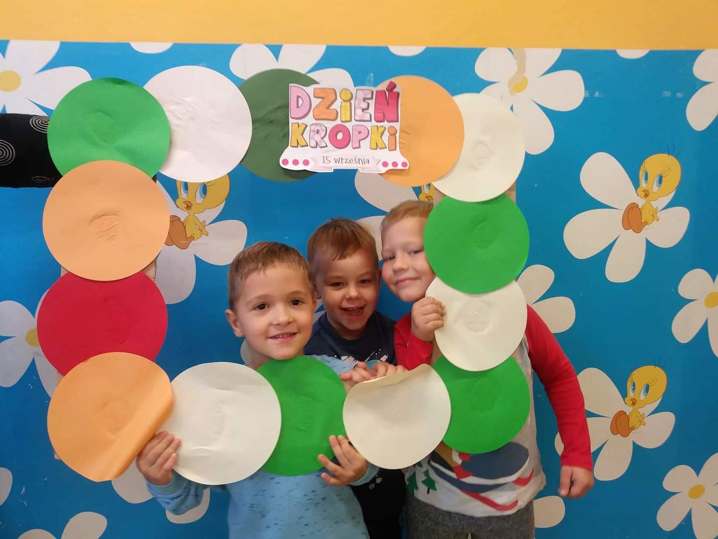 Międzynarodowy Dzień Kropki przypada 15 września. W tym dniu na dzieci uczęszczające do oddziału przedszkolnego, od samego rana, czekało wiele interesujących zadań, zabaw oraz ciekawych filmów edukacyjnych. Nie zabrakło również gimnastyki. Wszystkie dzieci mogły poczuć się jak prawdziwi detektywi – poszukując zaginionych kropek; jak artyści – tworząc różne figury oraz ciekawe prace plastyczne, jak modele – pozując do wspólnych oraz indywidualnych zdjęć. Wszystkie dzieci układały samodzielnie puzzle, starsze dzieci lepiły z plasteliny cyfrę 1. Każdy otrzymał specjalny znaczek. Na koniec zajęć każdy przedszkolak dostał pamiątkowy dyplom.