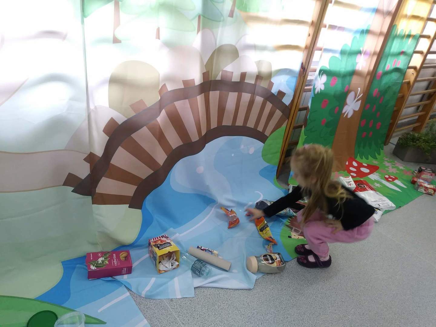 Przedszkolacy wybrali się dziś w niezwykłe bajeczne miejsce... trafiliśmy dziś do „pobliskiego lasu”, który specjalnie na to wydarzenie został stworzony na sali gimnastycznej. Jakież wielkie było zdziwienie przedszkolaków, gdy odkryli, że ktoś strasznie tam nabałaganił! Każdy przedszkolak uporządkował piękną polankę oraz rzeczkę.