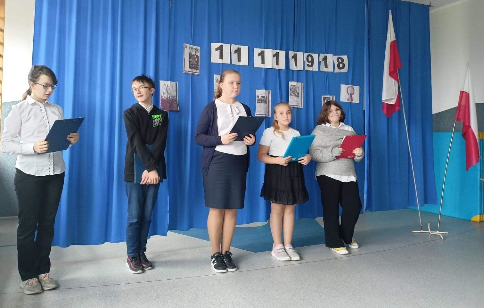 14 listopada w naszej szkole odbyła się uroczysta akademia z okazji rocznicy odzyskania niepodległości przez Polskę. Podczas tej uroczystości przypomniana została historia niewoli naszej ojczyzny, począwszy od dnia, kiedy Polska przestała istnieć na mapie Europy jako niepodległe państwo, przez dzieje tragicznej walki naszego narodu o wyzwolenie, aż po dzień odzyskania niepodległości. Przekazywane treści były przeplatane patriotycznymi pieśniami, co pozwoliło głębiej przeżyć tamte chwile.