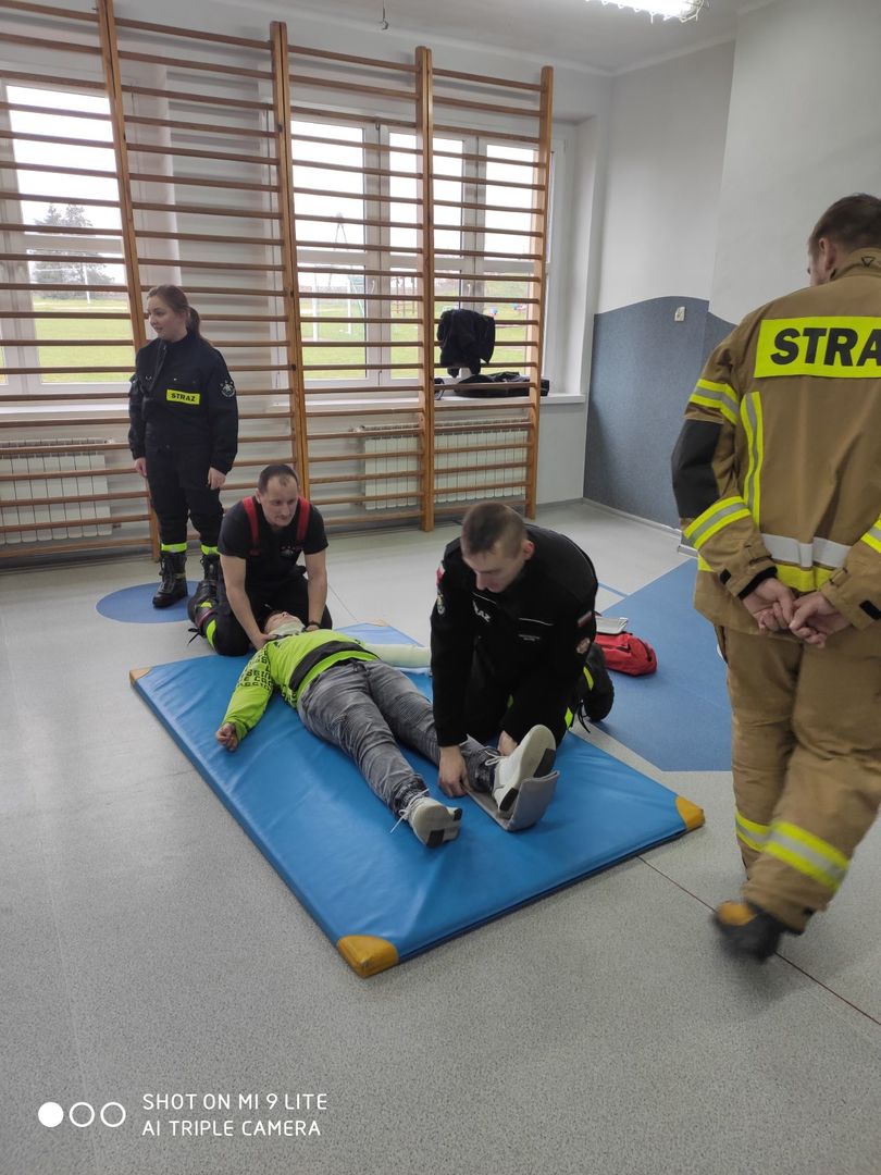 Po akcji strażacy przeprowadzili szkolenie na sali gimnastycznej w udzielaniu pierwszej pomocy przedmedycznej oraz instruktaż jak należy się zachować w przypadku, gdy ktoś z domowników straci przytomność.