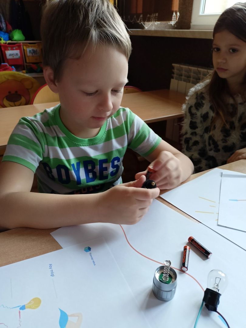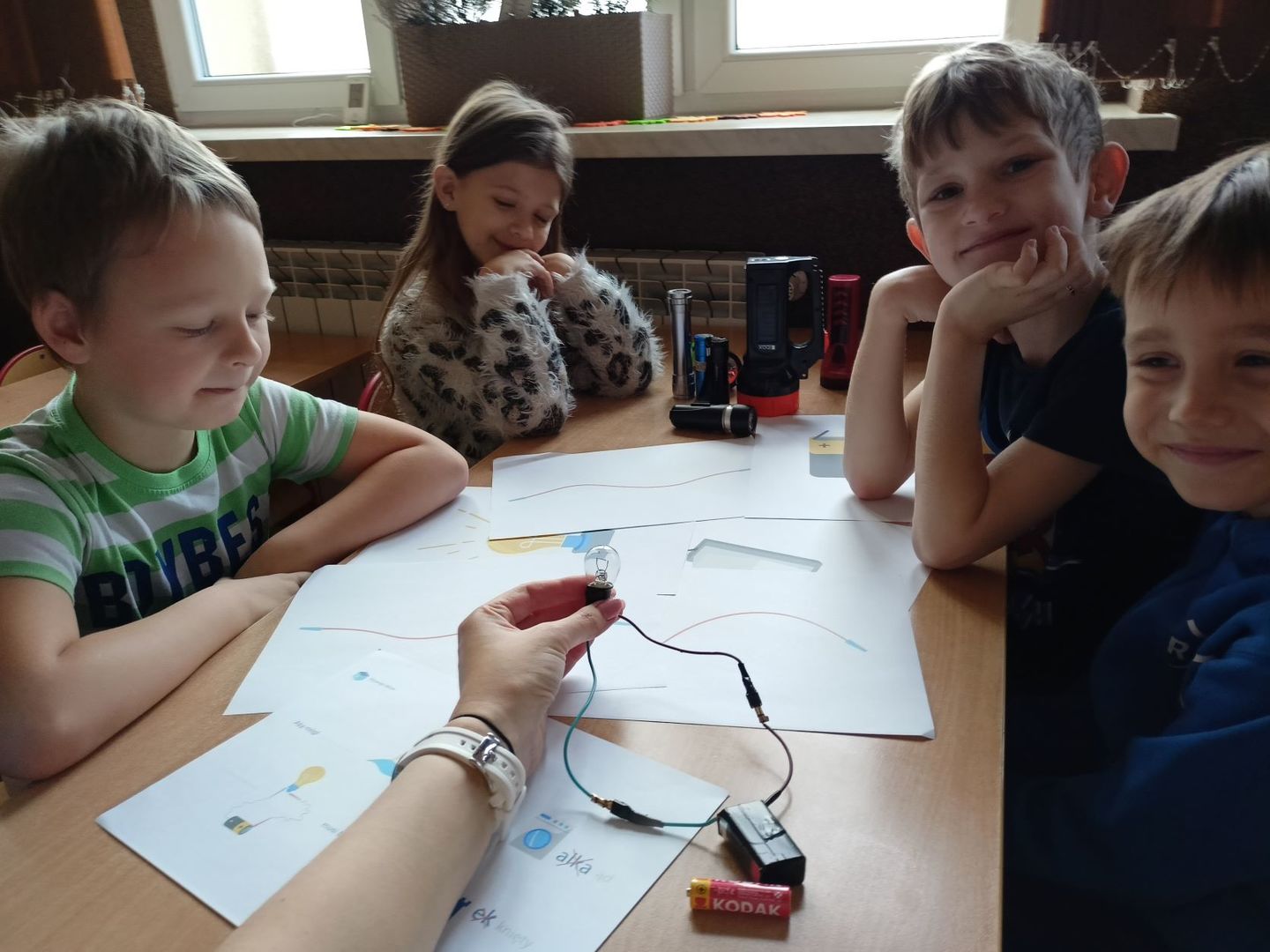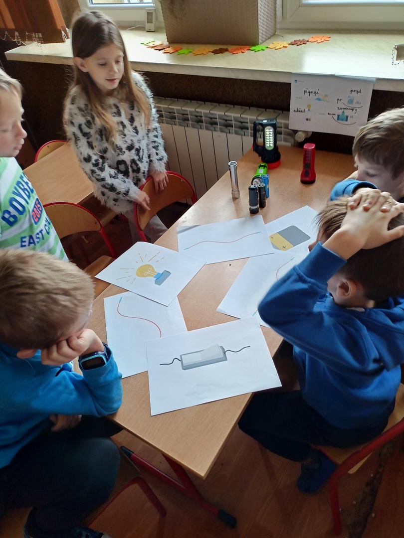 Jeszcze w listopadzie uczniowie klasy I postanowili zgłębić tematykę elektryczności oraz zasad bezpiecznego użytkowania urządzeń elektrycznych. W trakcie zajęć poznali reguły niezbędne do zbudowania obwodu elektrycznego. Dzięki zabawie w iskierkę zaobserwowali analogię między przesyłaniem impulsu a płynięciem prądu. Całą zdobytą wiedzę wykorzystali przy konstruowaniu obwodu elektrycznego. Nie mogło także zabraknąć wspólnego sformułowania zasad bezpiecznego korzystania z urządzeń elektrycznych oraz oszczędzania energii.