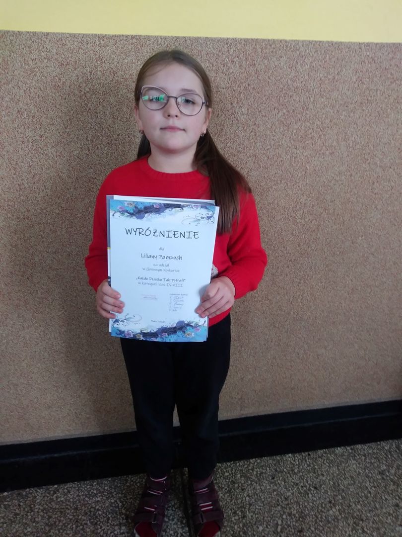 Uczennica klasy IV Liliana Pampuch wzięła udział w Gminnym Konkursie „Każde dziecko Tak Potrafi” organizowanym przez Szkołę Podstawową im. Jana Pawła II w Psarach. Liliana przygotowała ozdobę świąteczną, za którą otrzymała wyróżnienie w kategorii klas IV – VIII.