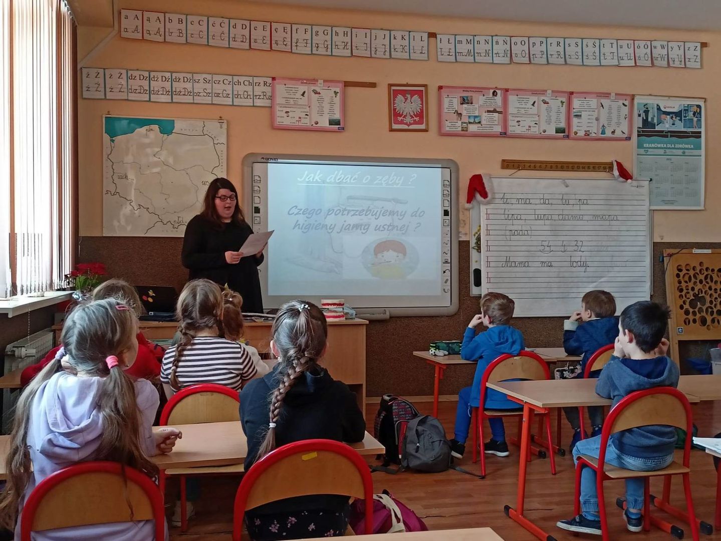 Uczniowie klas I-IV oraz oddziału przedszkolnego wzięli udział w wartościowych warsztatach profilaktycznych dotyczących właściwej higieny jamy ustnej i prawidłowego odżywiania się.