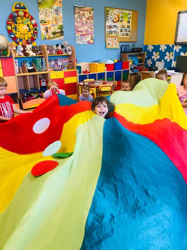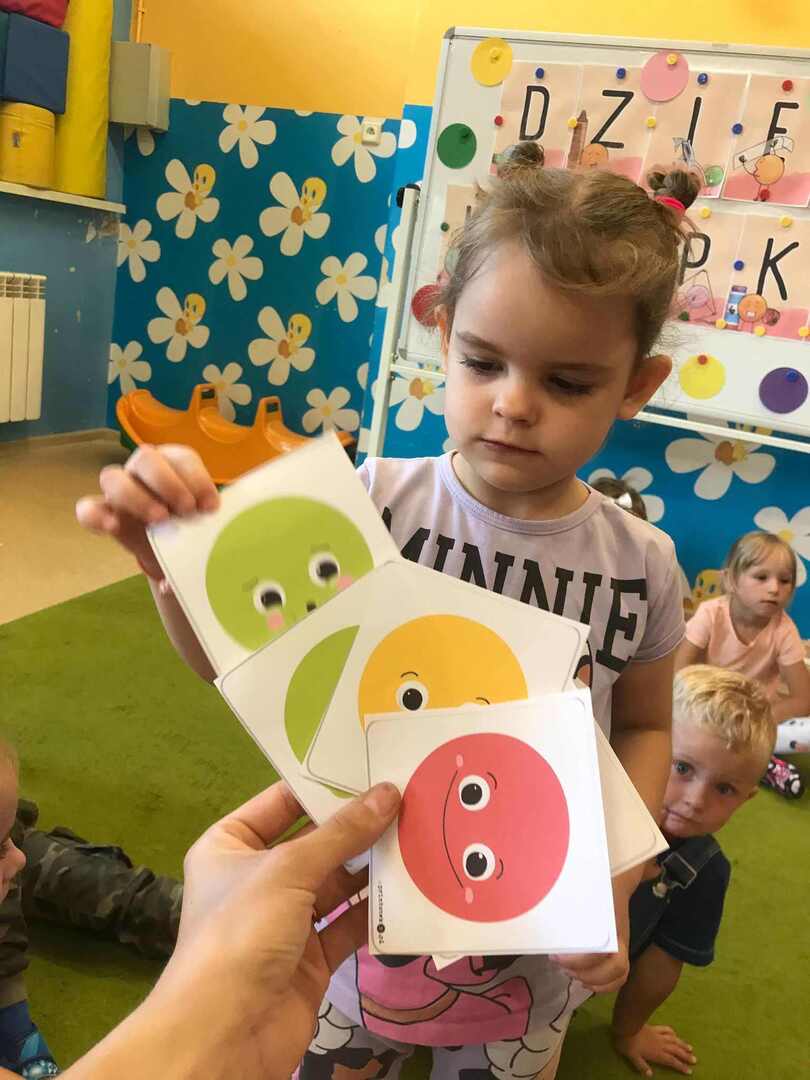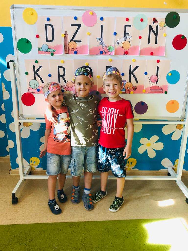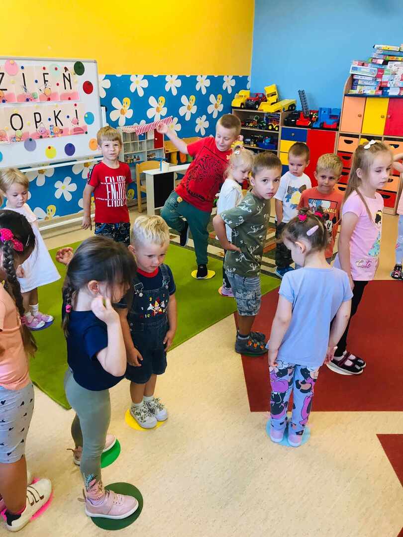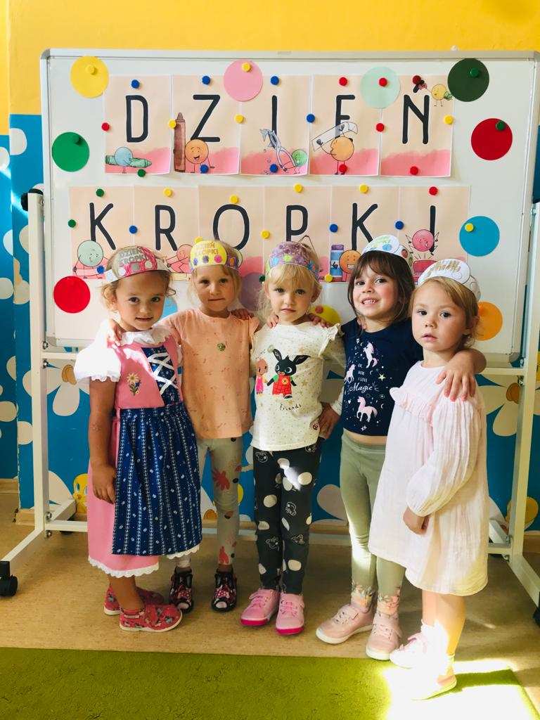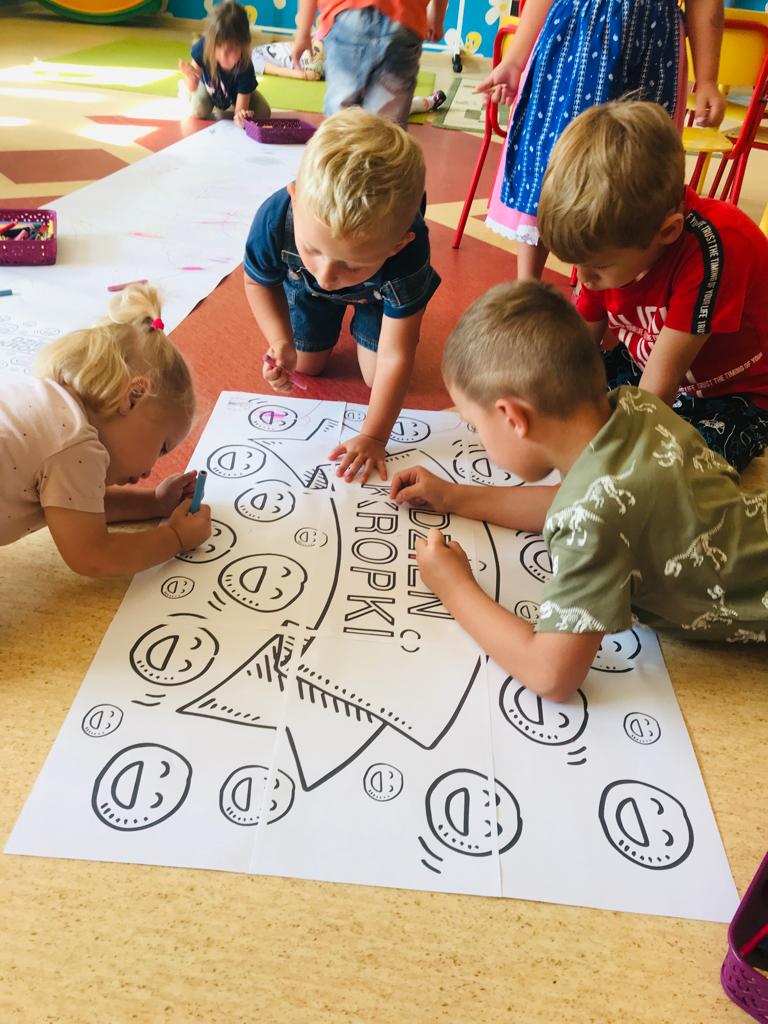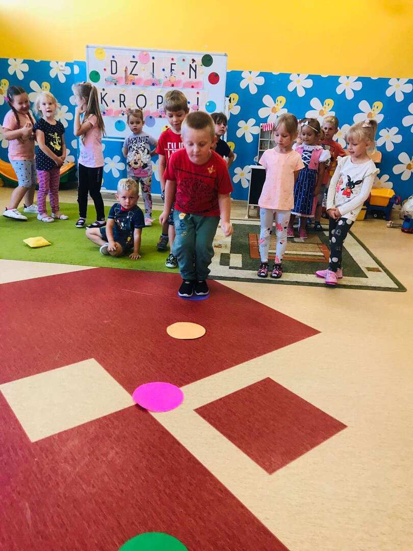 Tego dnia dzieci dostrzegały kropki tam, gdzie wcześniej nikt na nie nie zwracał uwagi. Okazało się, że kropki towarzyszą nam w codziennym życiu. Są na skrzydełkach biedronki, w mebelkach i zabawkach przedszkolnych a nawet zdobią kapelusz muchomora. Dzieci wspólnie bawiły się z kropką, liczyły kropki, skakały po kropkach, z kropek ułożyły piękny chodniczek. Dzieci wykonały kropkowe opaski oraz pokolorowały kolorowankę xxl. Wesoło spędziliśmy ten dzień.