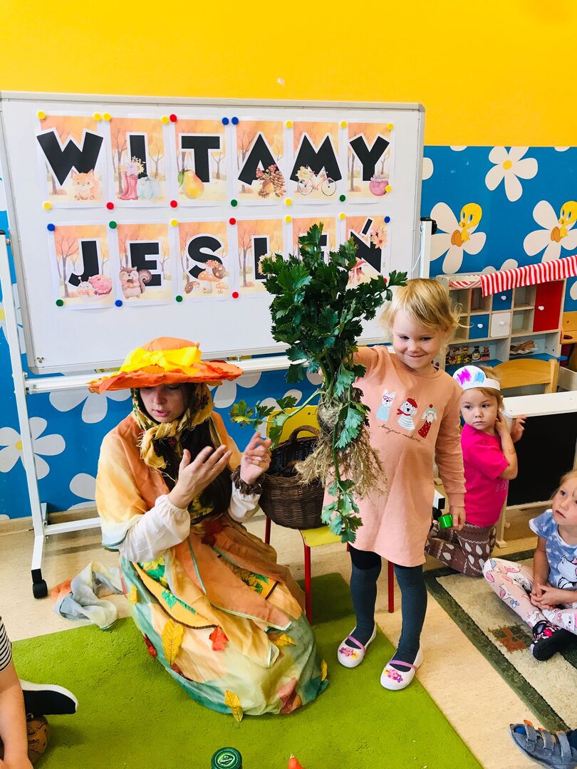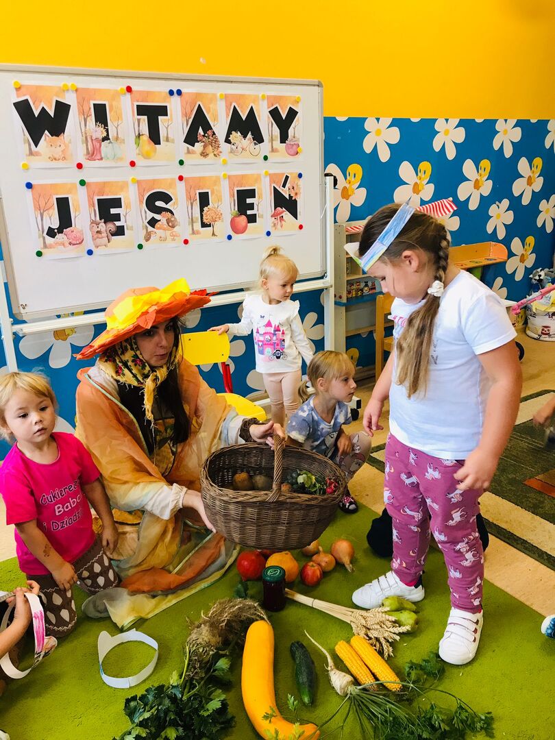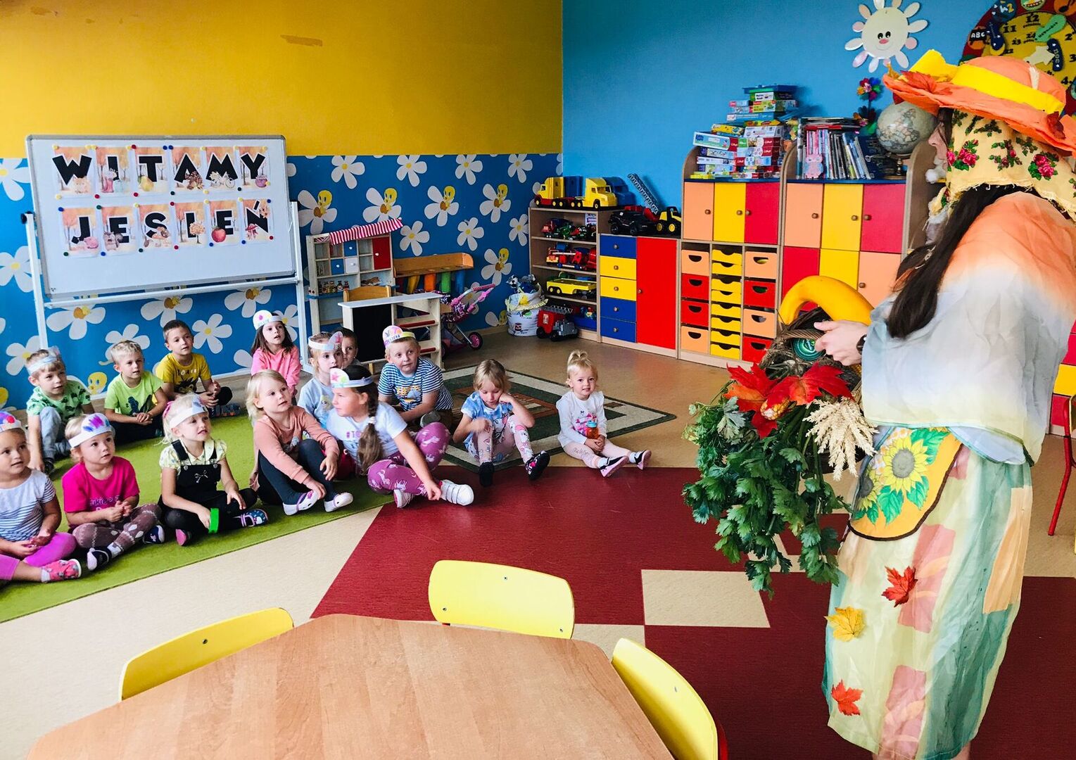 Za oknami już nowa pora roku, dlatego w przedszkolu powitaliśmy miłego gościa – Panią Jesień. Z koszem pięknych jesiennych darów, Pani Jesień odwiedziła przedszkolaki, aby wspólnie z nimi się bawić i porozmawiać o zachodzących w przyrodzie zmianach. Celem zabaw było utrwalenie wiadomości o jesieni, integrowanie się dzieci, a przede wszystkim wspaniała zabawa. Pląsom i zabawom towarzyszyła muzyka i jesienne piosenki: „Pani Jesień”, „Liście w parku”, „Jeż”, „Kolorowe listki”. Dzień ten upłynął w bardzo miłym nastroju.