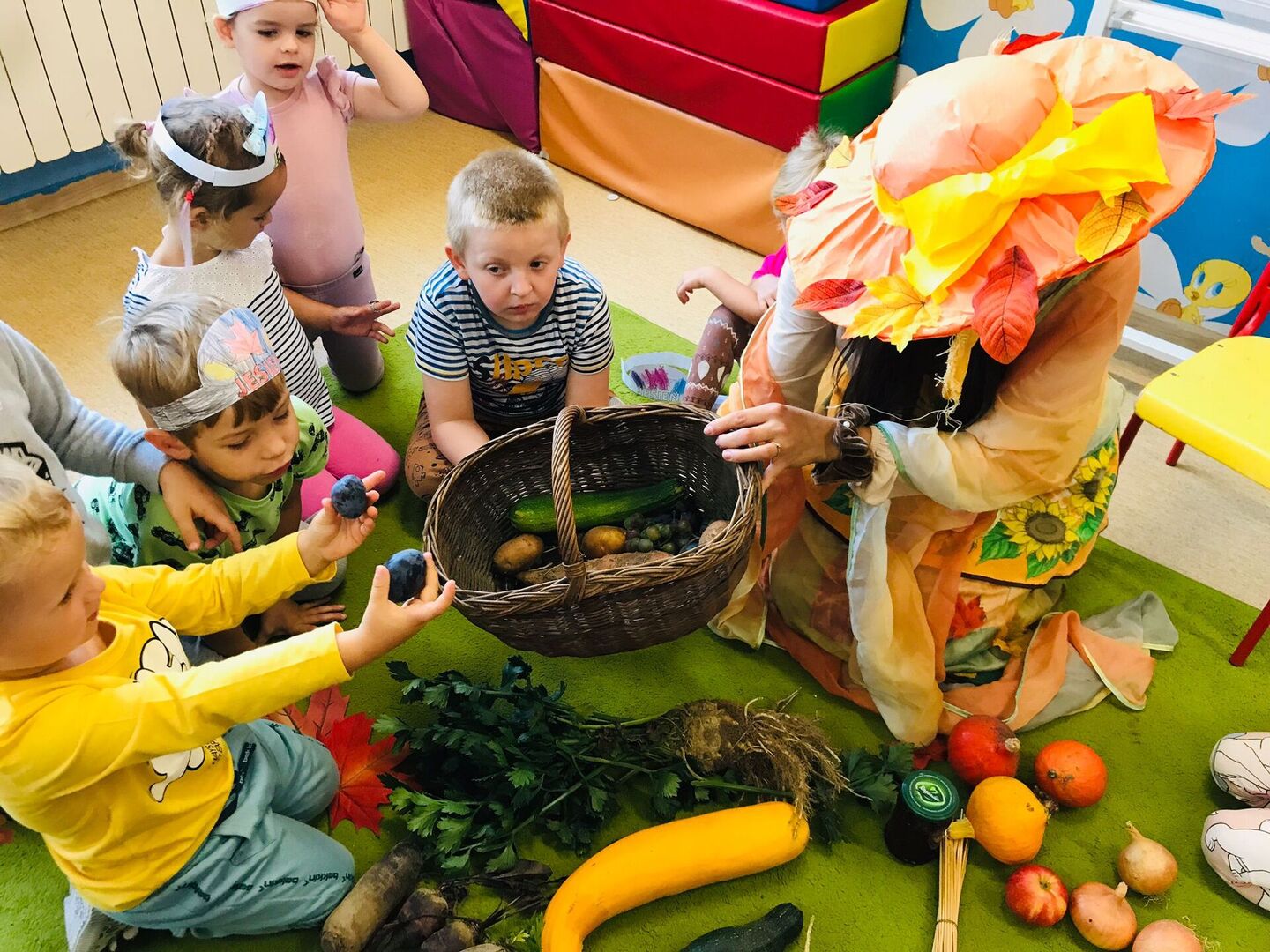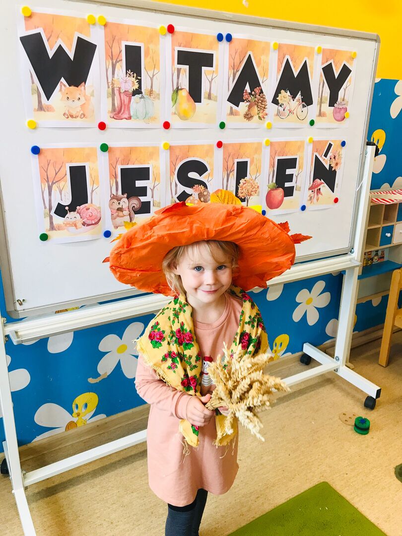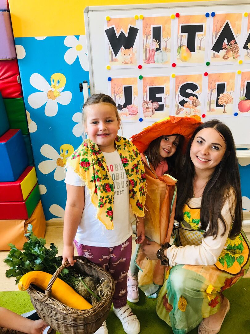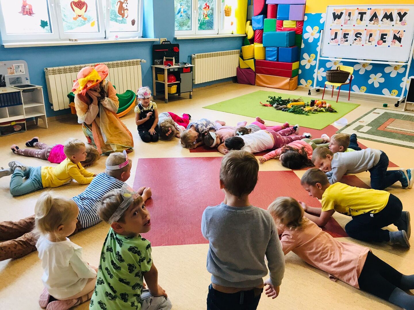 Za oknami już nowa pora roku, dlatego w przedszkolu powitaliśmy miłego gościa – Panią Jesień. Z koszem pięknych jesiennych darów, Pani Jesień odwiedziła przedszkolaki, aby wspólnie z nimi się bawić i porozmawiać o zachodzących w przyrodzie zmianach. Celem zabaw było utrwalenie wiadomości o jesieni, integrowanie się dzieci, a przede wszystkim wspaniała zabawa. Pląsom i zabawom towarzyszyła muzyka i jesienne piosenki: „Pani Jesień”, „Liście w parku”, „Jeż”, „Kolorowe listki”. Dzień ten upłynął w bardzo miłym nastroju.