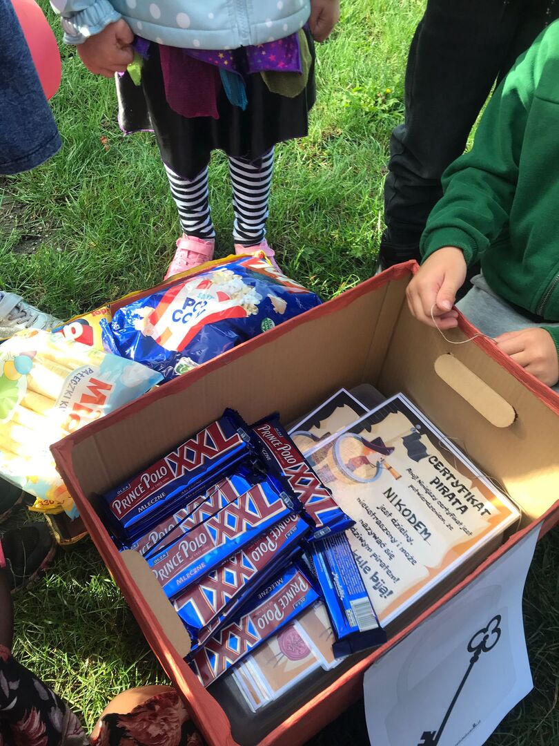 .Po odnalezieniu wszystkich wskazówek oraz wykonaniu zadań dzieci dotarły do skarbu w którym znajdowało się mnóstwo smakołyków oraz dyplomy z okazji Dnia Chłopaka.