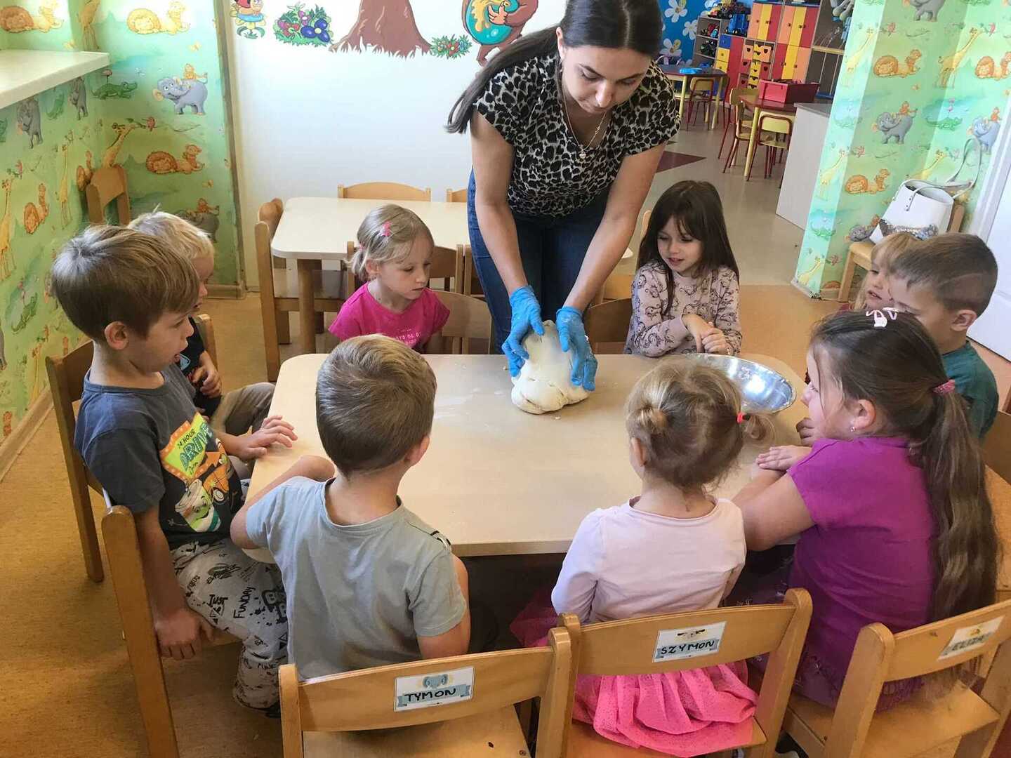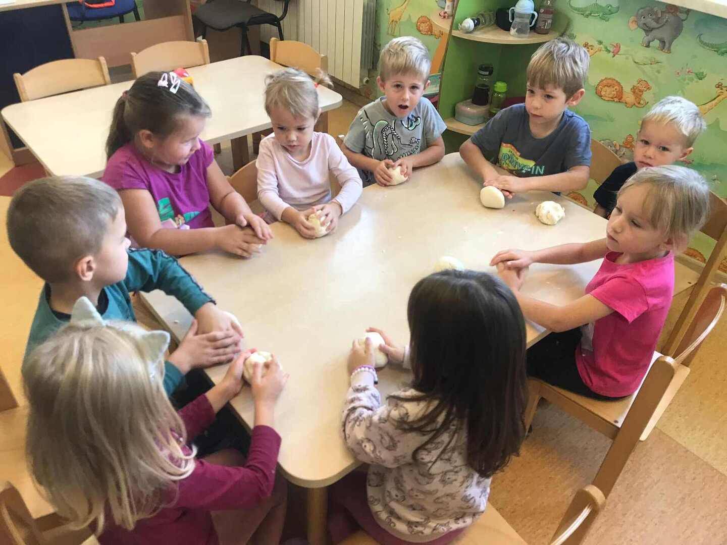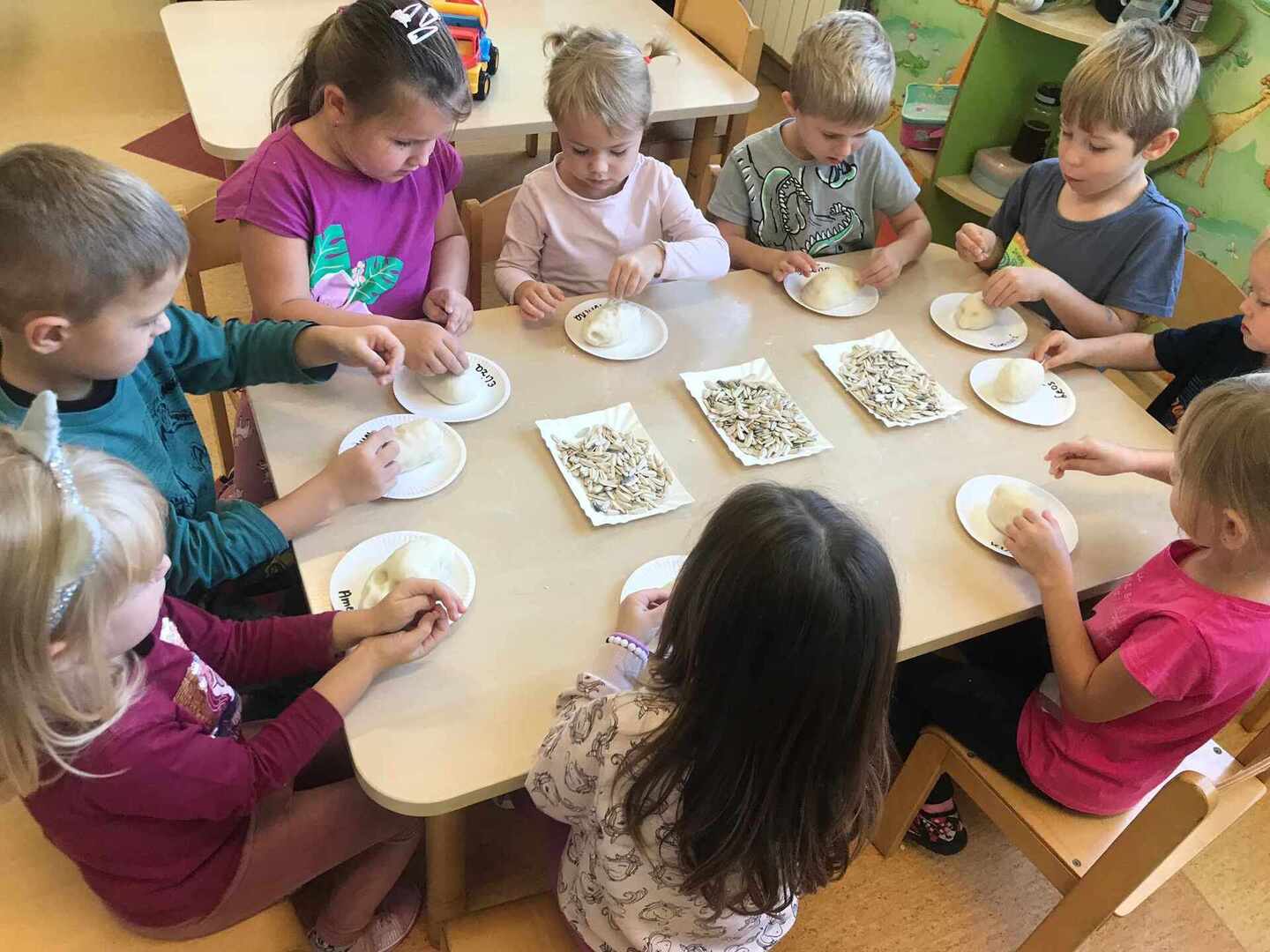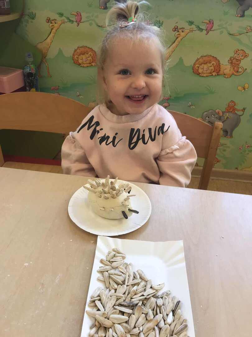 Przedszkolaki musiały najpierw poznać przepis, wsypać do miski składniki oraz je wymieszać. Następnie nadały kształt jeżykowi, uformowały mu nosek i oczka, a także ostrożnie powkładały w jego grzbiet słonecznik. Dzieci poznały prosty przepis na masę solną i mogły zobaczyć, jak się ją przygotowuje. Wykonanie jeżyka wymagało od każdego dużego zaangażowania, ale jedno jest pewne – wszyscy świetnie się bawili podczas tej twórczej pracy.