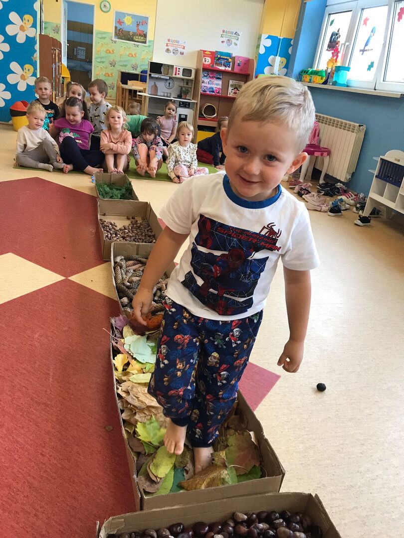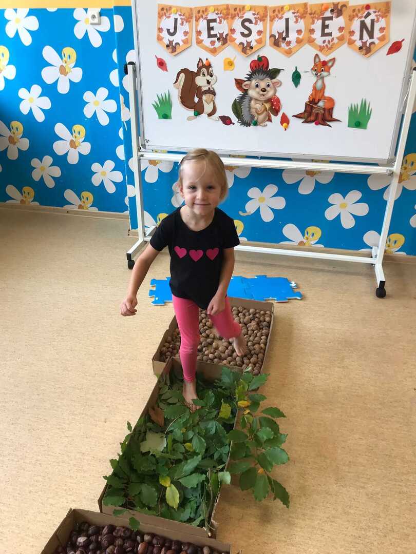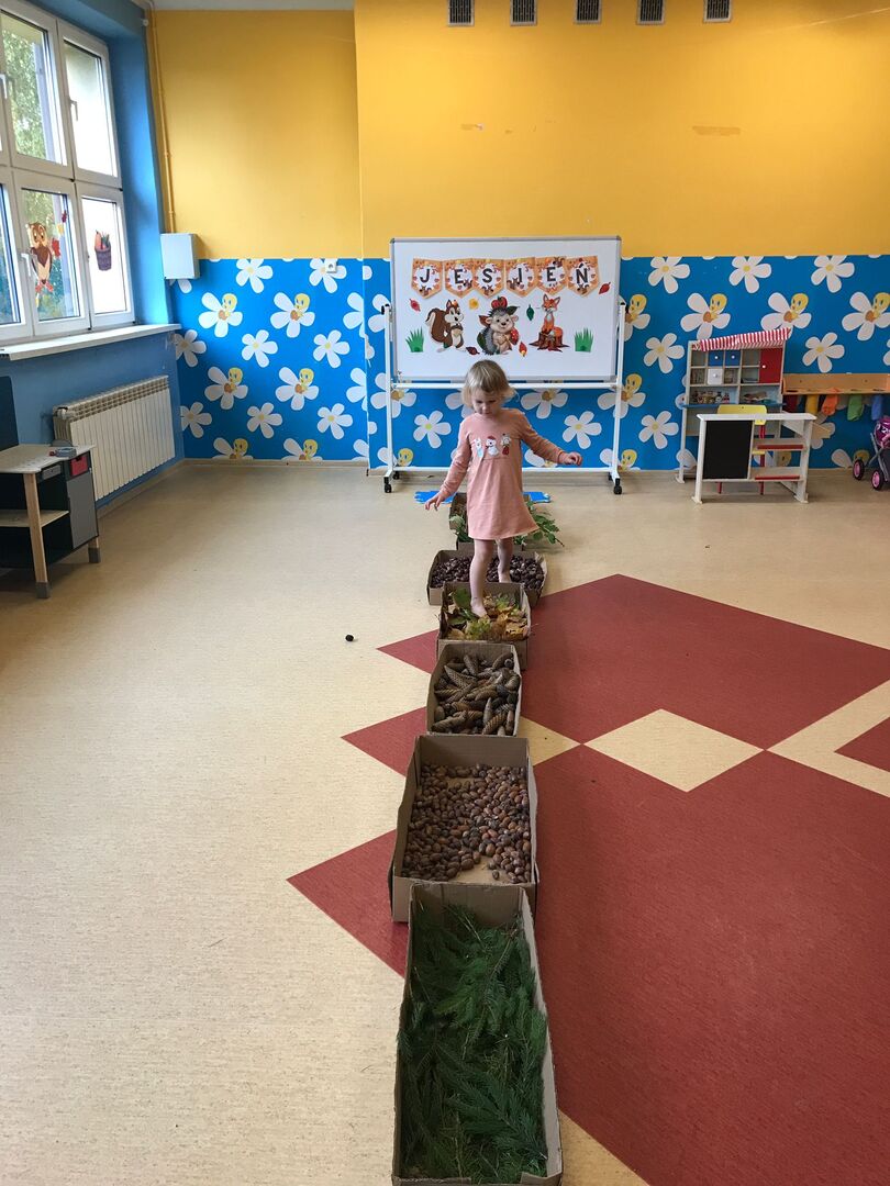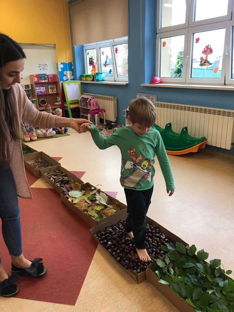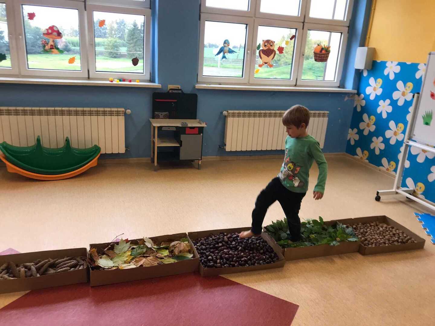 Za oknami piękna Polska złota jesień, która jest okazją do wielu rozmów, zabaw, ciekawych prac, jak również podejmowania nowych doświadczeń. Jednym z nich była jesienna ścieżka sensoryczna, którą dzieci wspólnie przygotowały z zebranych darów z parku i lasu.