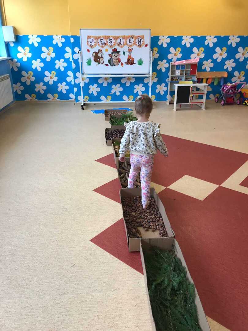 Jesienna ścieżka sensoryczna w ramach Innowacji pedagogicznej „SENSOZABAWY- bawię się i rozwijam zmysły„.👣🍁
