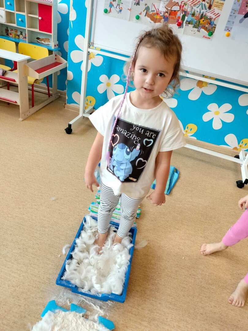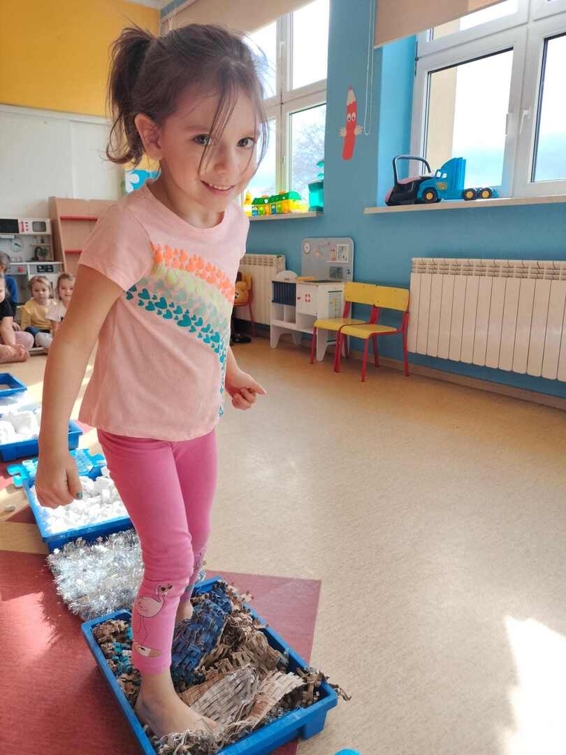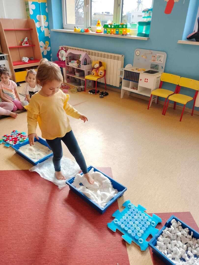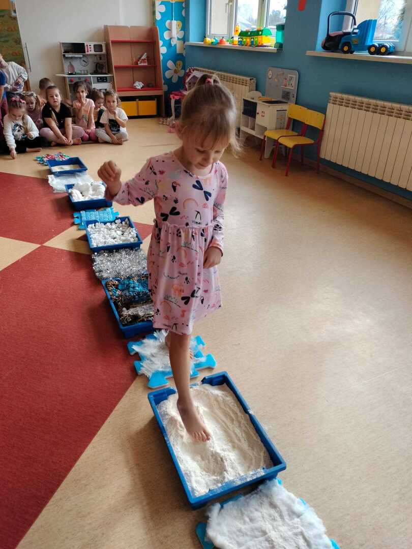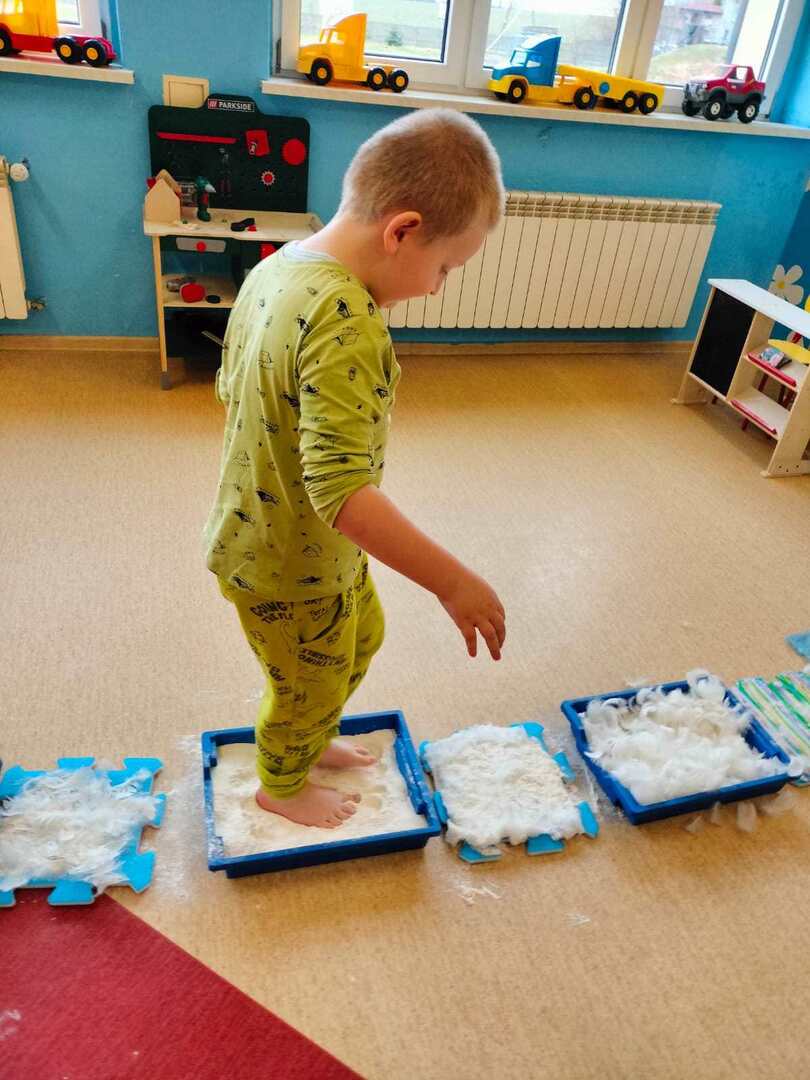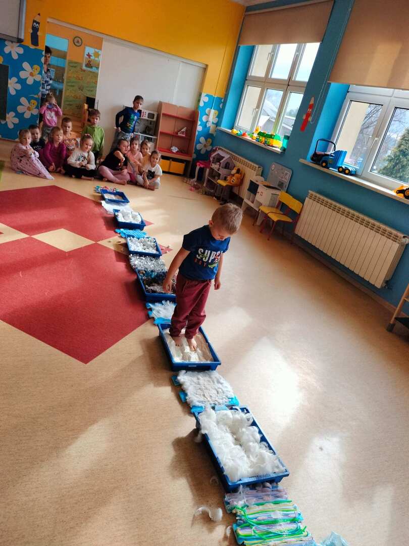 Pomimo, że obecnie śniegu za oknem brakuje dzieci z naszego przedszkola wzięły udział w "Zimowej ścieżce sensorycznej" składającej się z produktów i materiałów w kolorze białym.