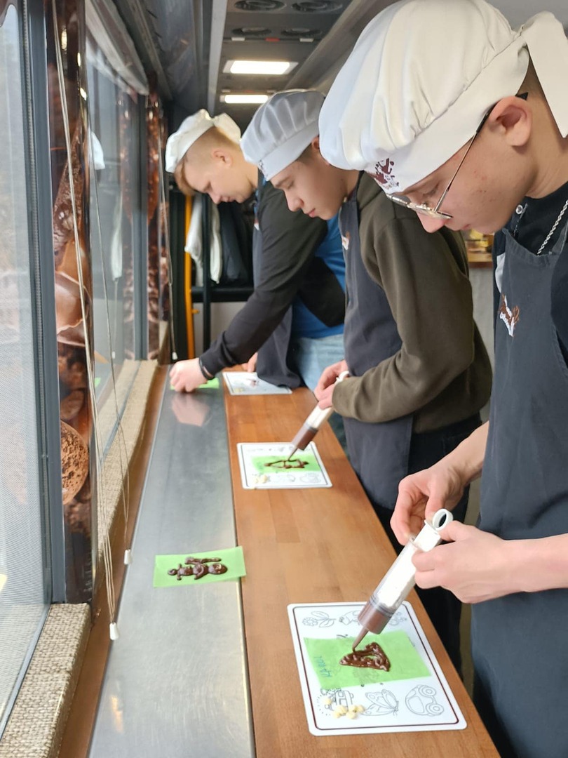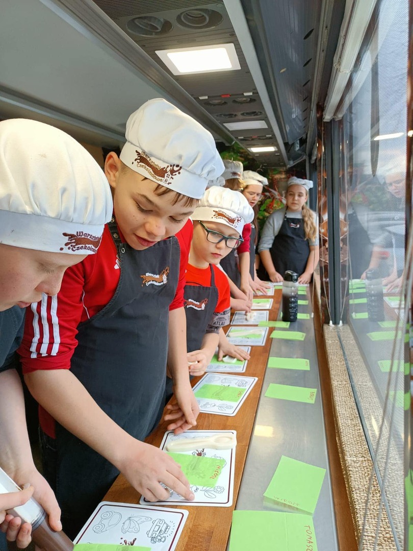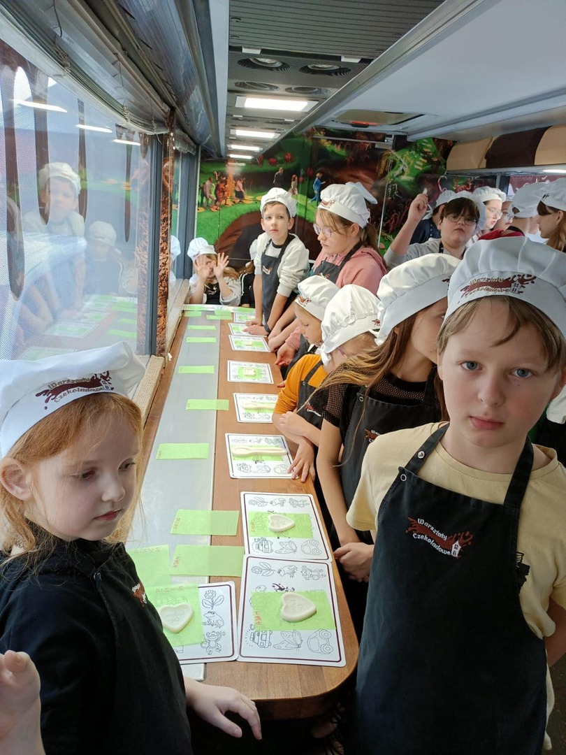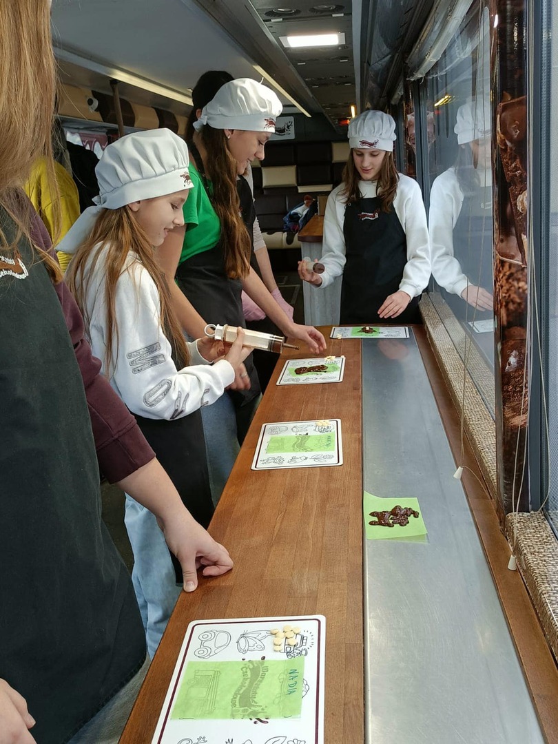 W dniu 3 lutego odwiedził naszych uczniów "Czekoladowy Autobus" ze Słupska - to jedyny autobus w Polsce, w którym dzieci przeniosły się w czekoladowy świat. Każde dziecko mogło się poczuć jak prawdziwy Master Chef - w tym celu wszyscy uczestnicy warsztatów byli ubrani w specjalne czapki i fartuchy . Dzieci zapoznały się z historią czekolady. Kolejnym punktem programu była degustacja trzech rodzajów czekolady. Do zajęć wykorzystano zdrową czekoladę o zawartości 85% kakao. Uczniowie rysowali różne wzory czekoladą i ozdabiali ją innymi rodzajami masy czekoladowej. Na zakończenie odbyło się wręczenie każdemu dziecku dyplomu Mistrza Czekolady. Swoje czekoladowe prace, były spakowane do kartoników, w których dzieci zabrały ze sobą do domu.