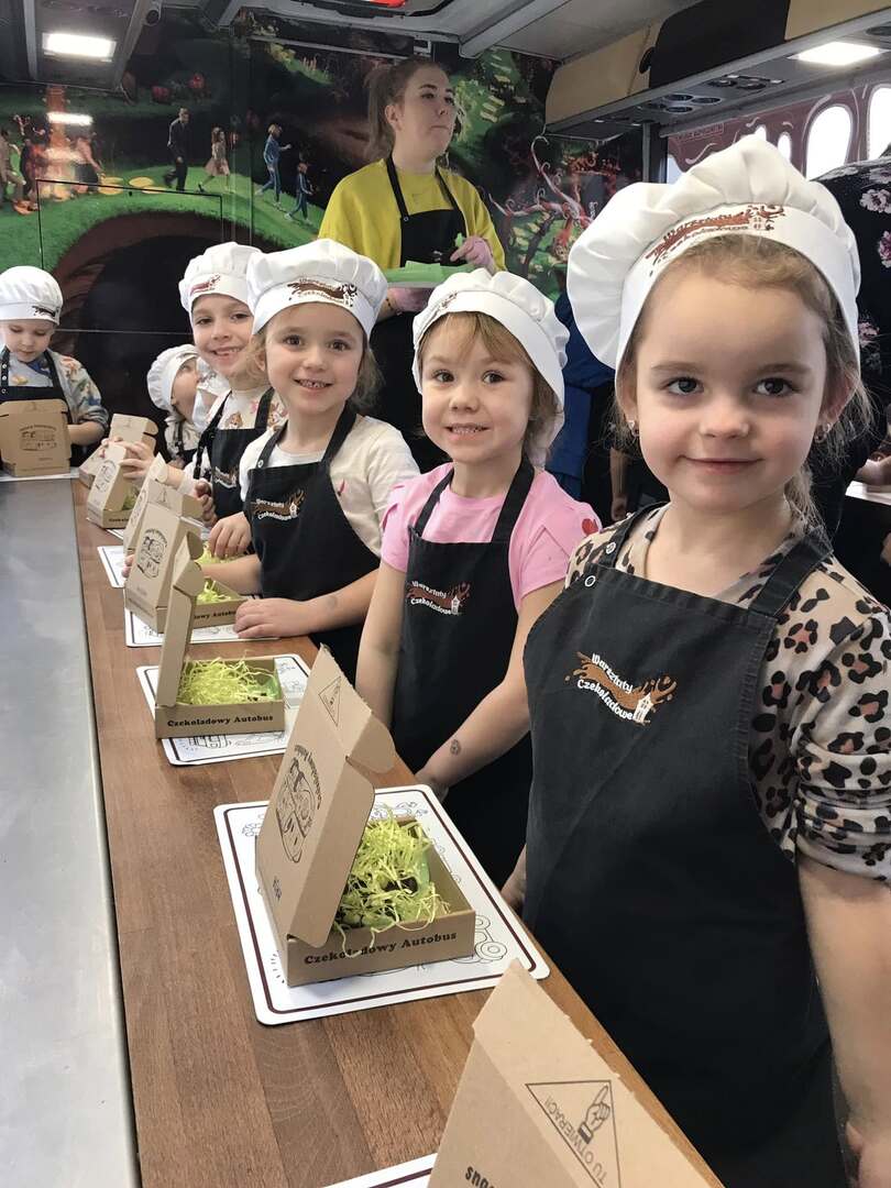 Dziś do naszego przedszkola przyjechał „Czekoladowy autobus”. Na ten dzień wszystkie dzieci czekały z niecierpliwością. Tuż po wejściu do niezwykłego autobusu każdy przedszkolak został ubrany w specjalną czapkę oraz fartuszek i poczuł się jak prawdziwy MasterChef.