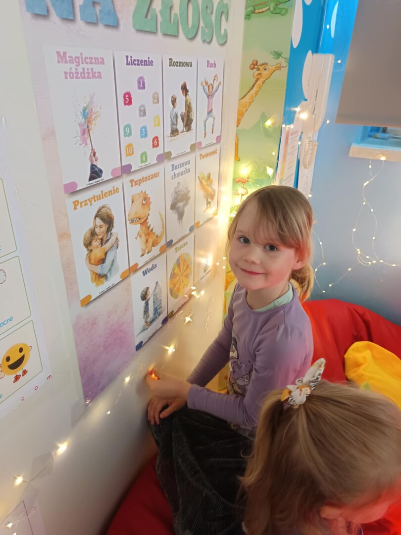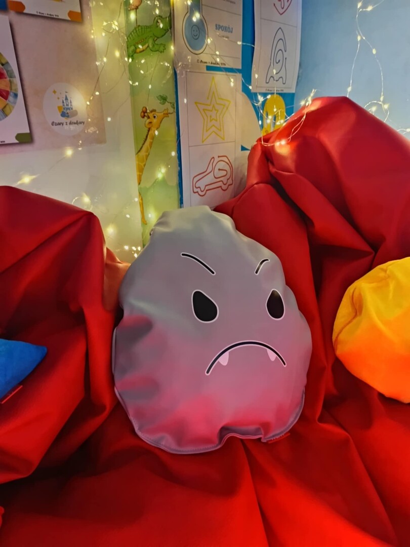 Zajęcia zaowocowały w wyjątkowe miejsce: Kącik Odreagowywania Emocji, w którym dzieci mogą odpocząć, przytulić się do poduszki, wybrać metodę na poradzenie sobie ze złością, wskazać buźkę odpowiadającą ich nastrojowi, porozmawiać lub po prostu… pobyć chwilę ze sobą.