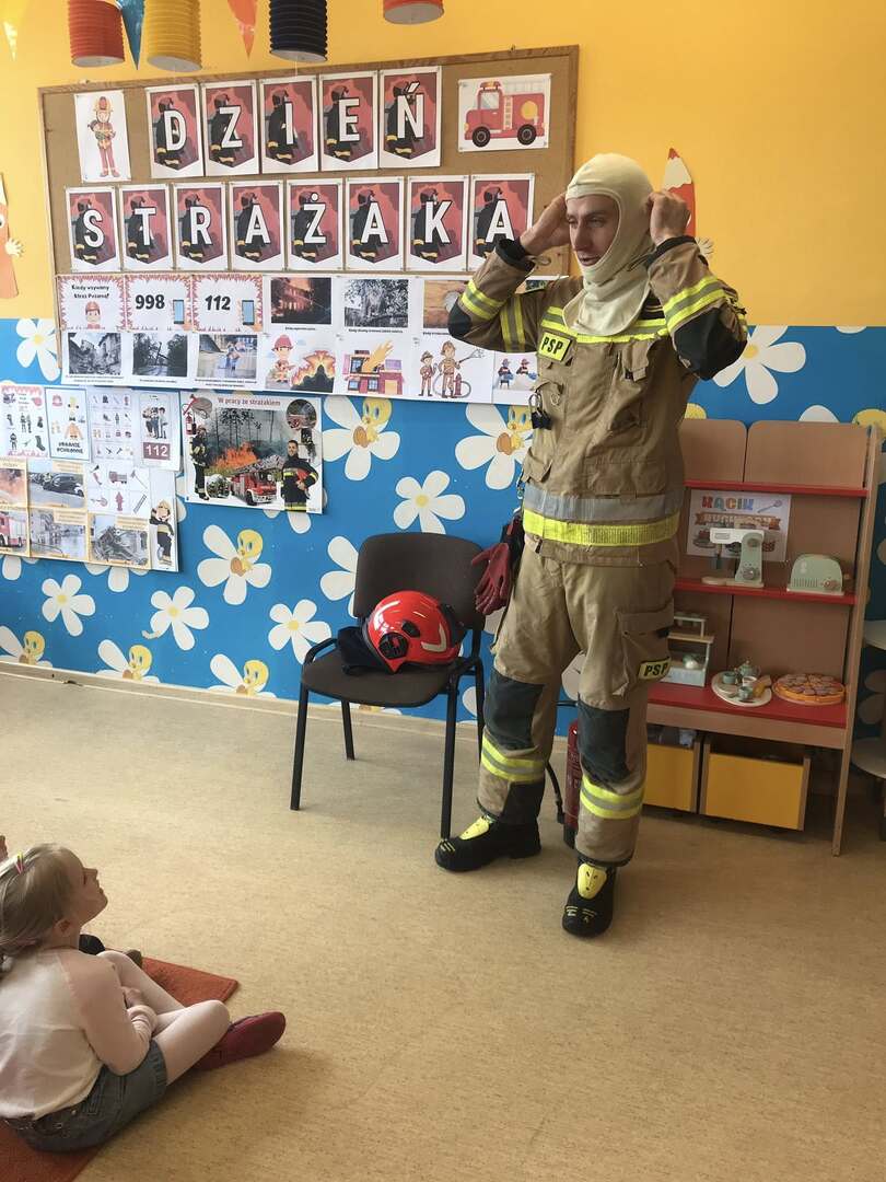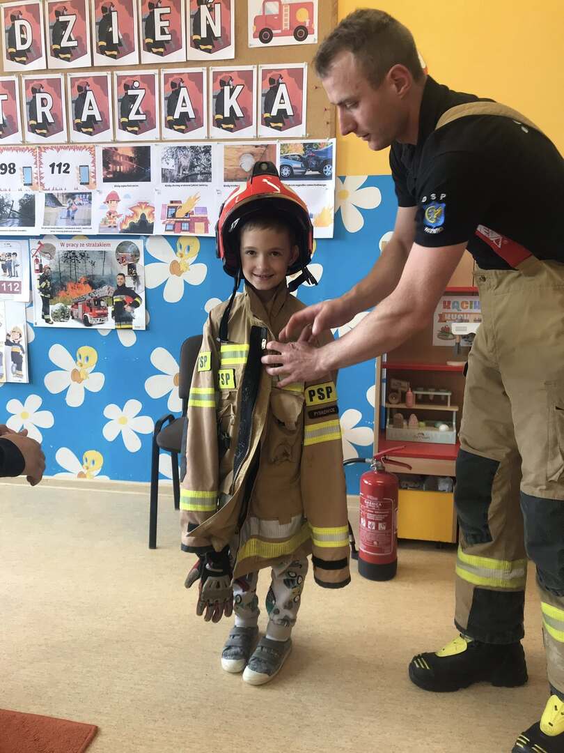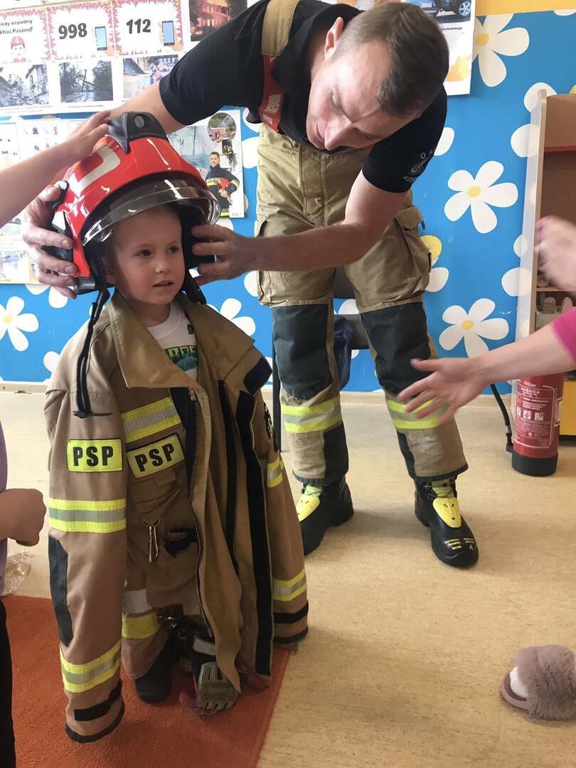Nasze przedszkolaki miały okazję wcielić się dziś w rolę prawdziwych bohaterów! Chętne dzieci mogły przymierzyć strażacki mundur oraz chełm i poczuć się jak członek dzielnej drużyny ratowniczej.