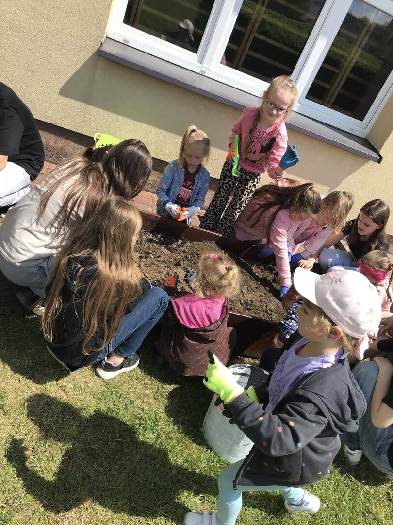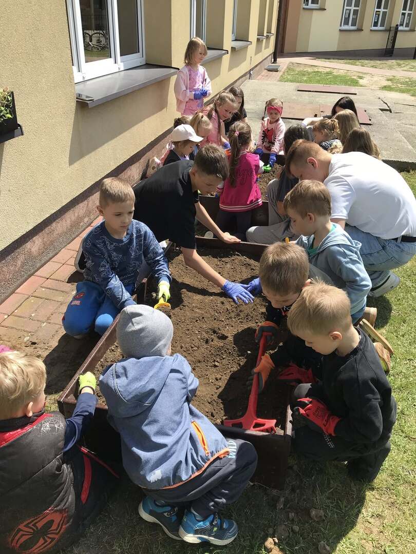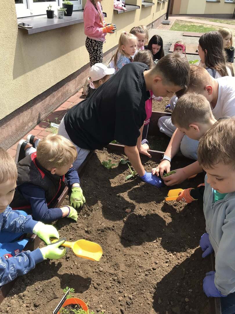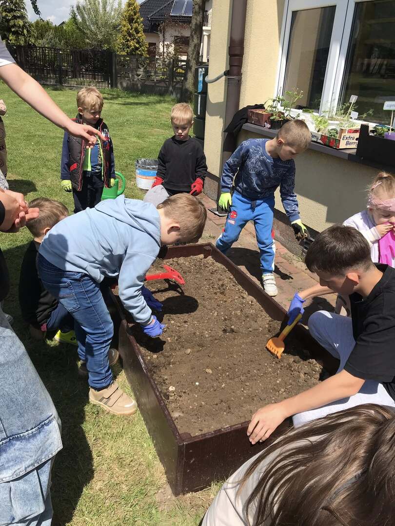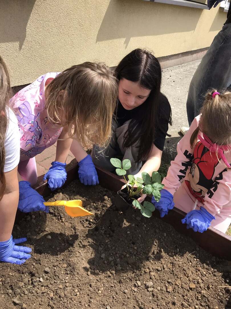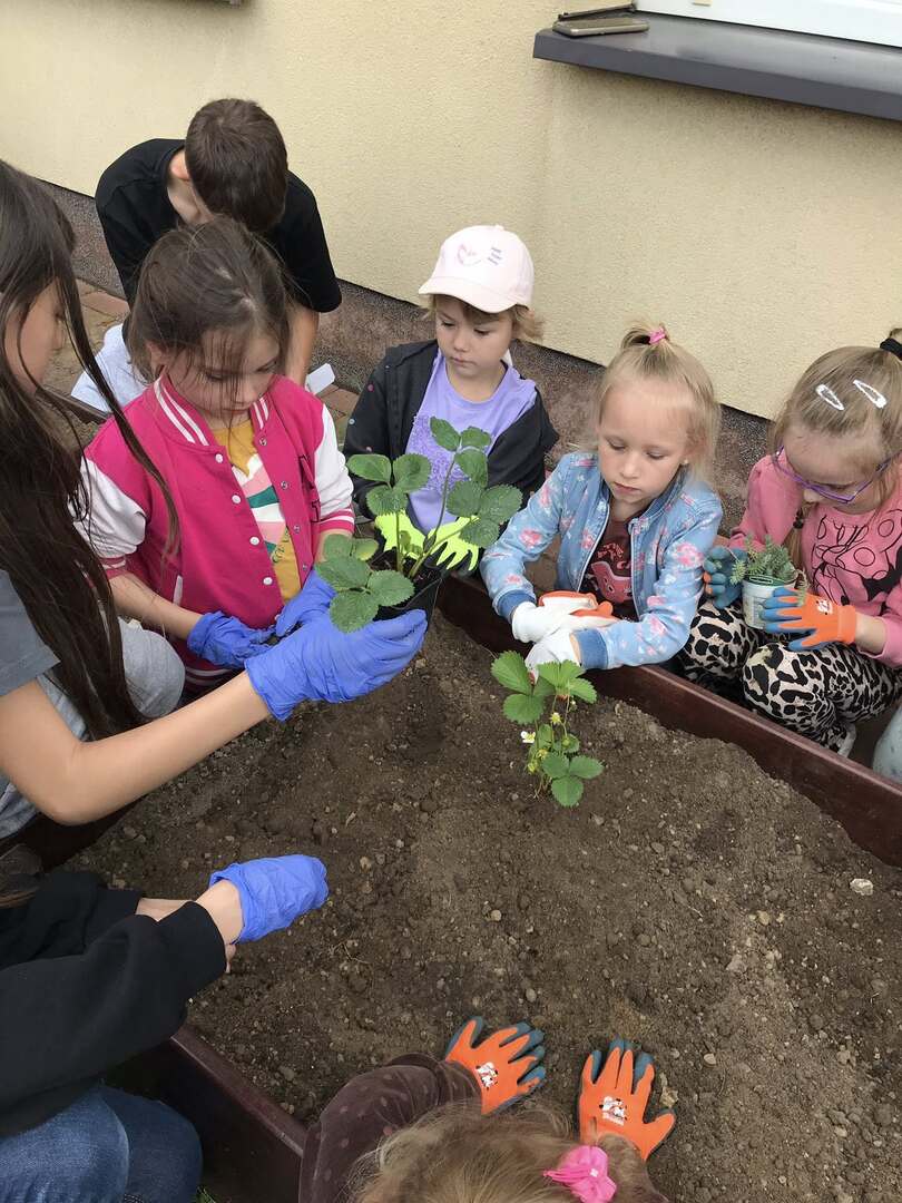 Dziś nasze przedszkolaki zamieniły się w małych ogrodników! Z pomocą starszych kolegów z klasy 7, działających w szkolnym kółku ekologicznym, zasadziły rośliny na wysokiej grządce przy naszym przedszkolu.