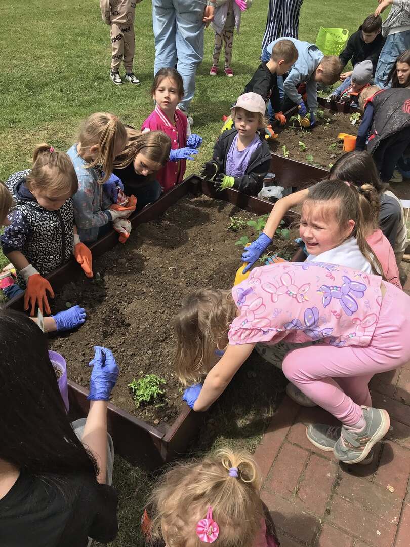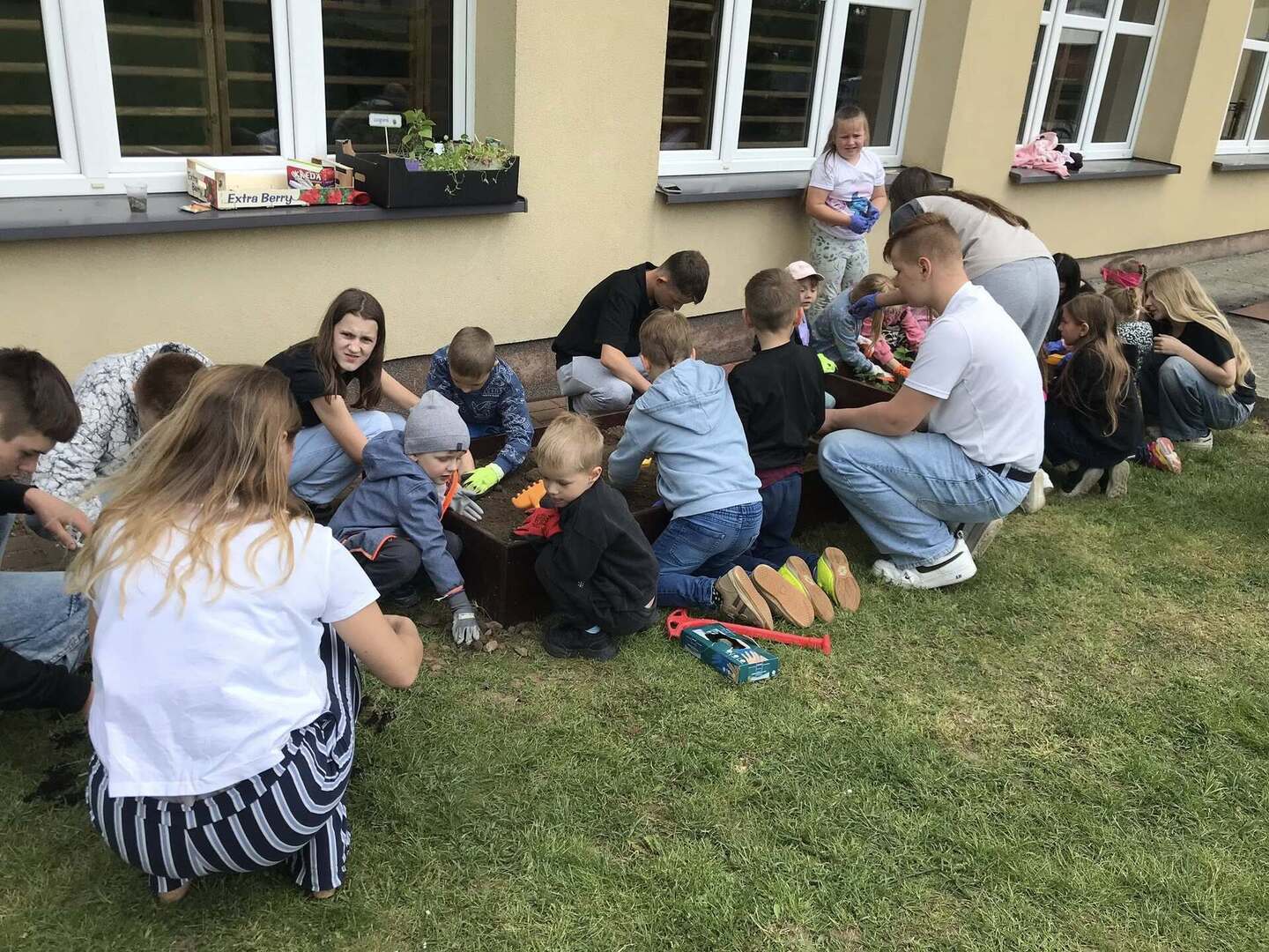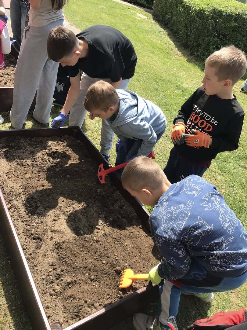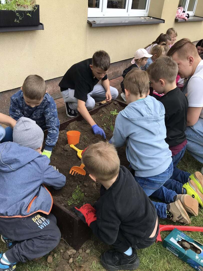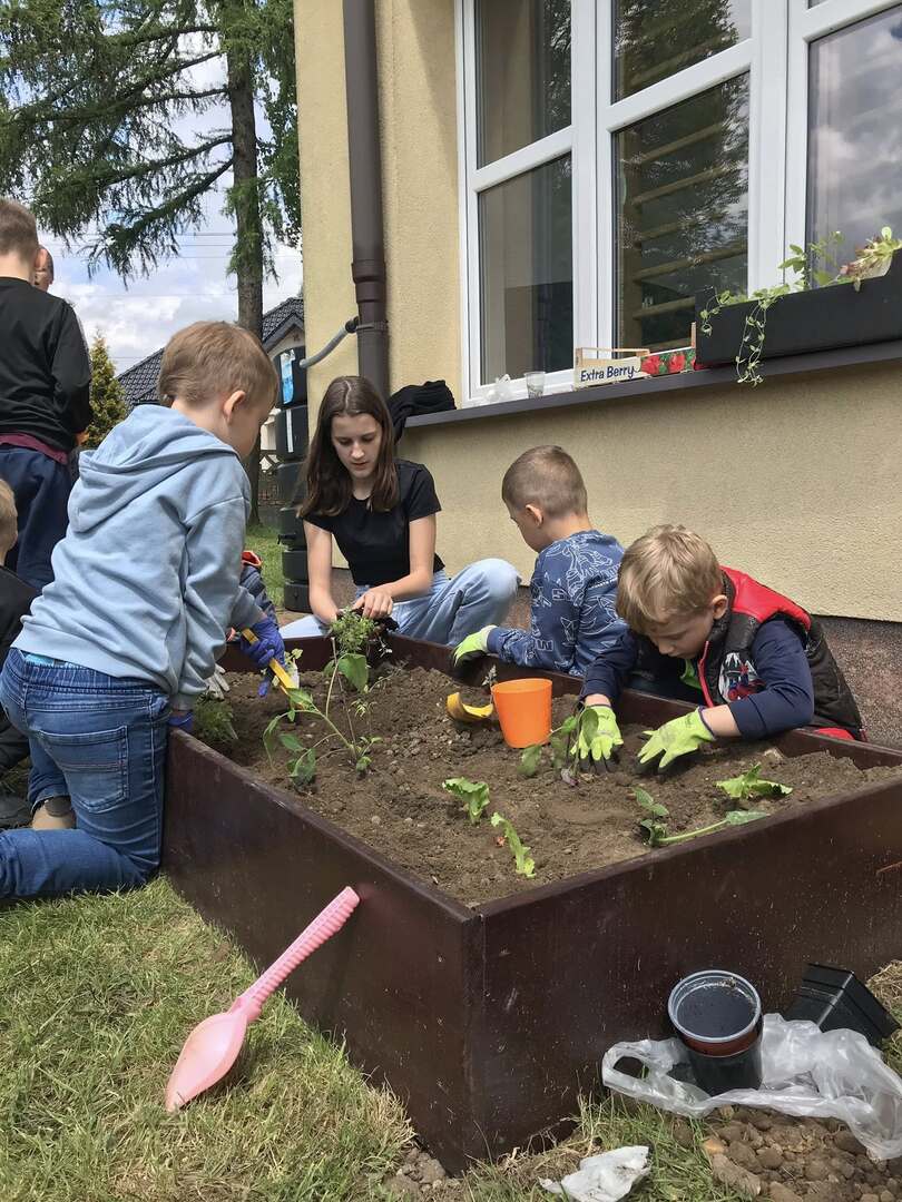 Dziś nasze przedszkolaki zamieniły się w małych ogrodników! Z pomocą starszych kolegów z klasy 7, działających w szkolnym kółku ekologicznym, zasadziły rośliny na wysokiej grządce przy naszym przedszkolu.