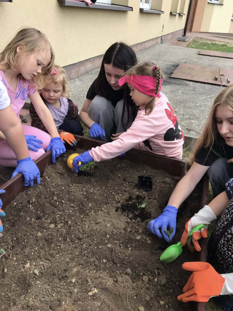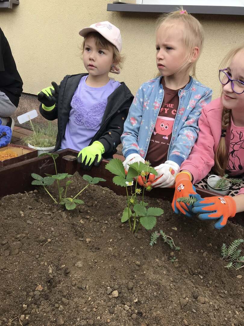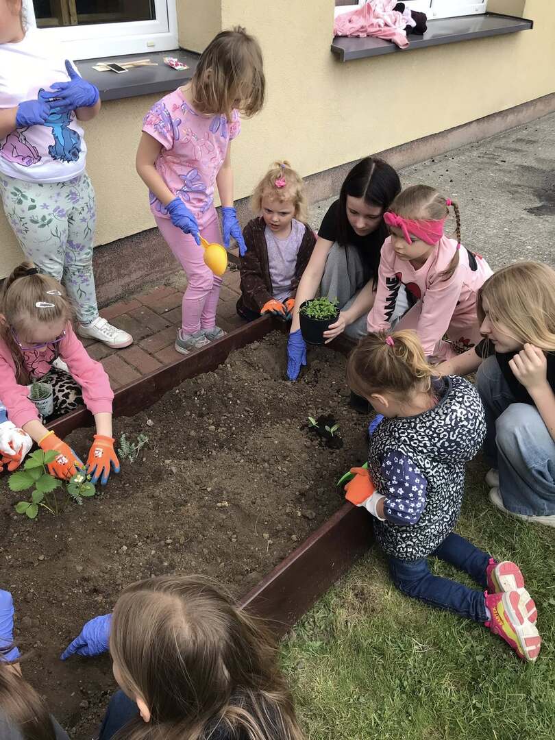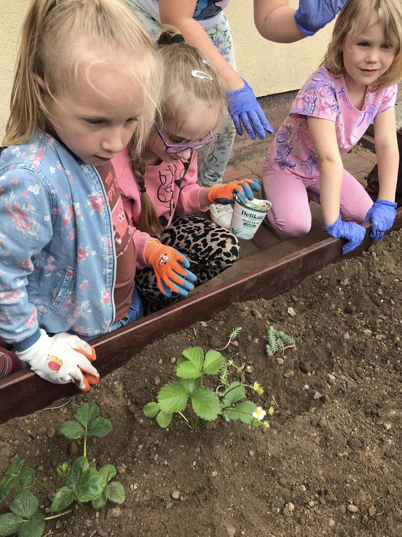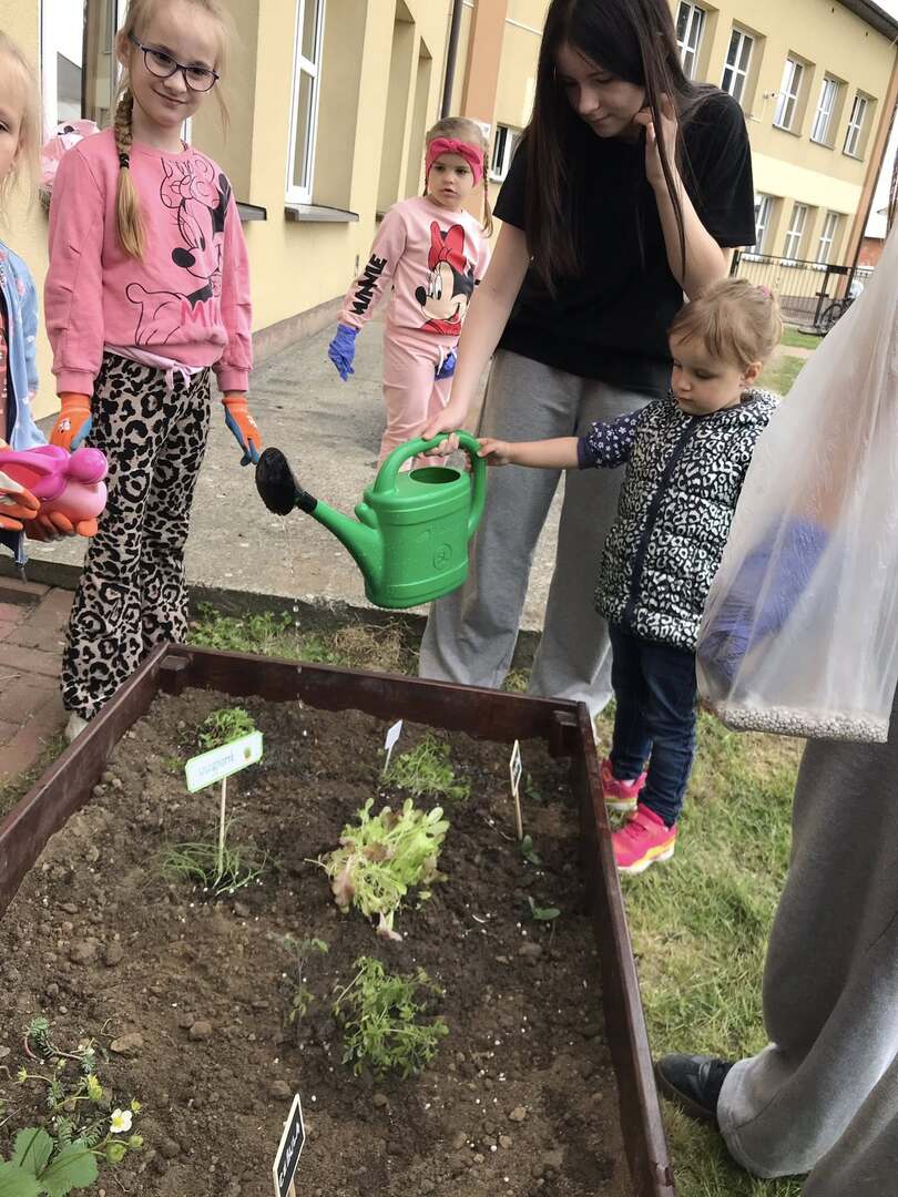 W ziemi znalazły swoje miejsce: truskawki, pomidory, sałata, ogórki, cukinia, rzodkiewka, słonecznik, aksamitki i wiele innych roślin. Na koniec przedszkolaki nie zapomniały o podlewaniu swoich roślin.