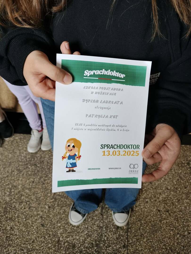 Z ogromną radością informujemy, że Patrycja Kot, uczennica klasy V, została laureatką ogólnopolskiego konkursu Sprachdoktor, zajmując I miejsce w województwie i IV miejsce w kraju!