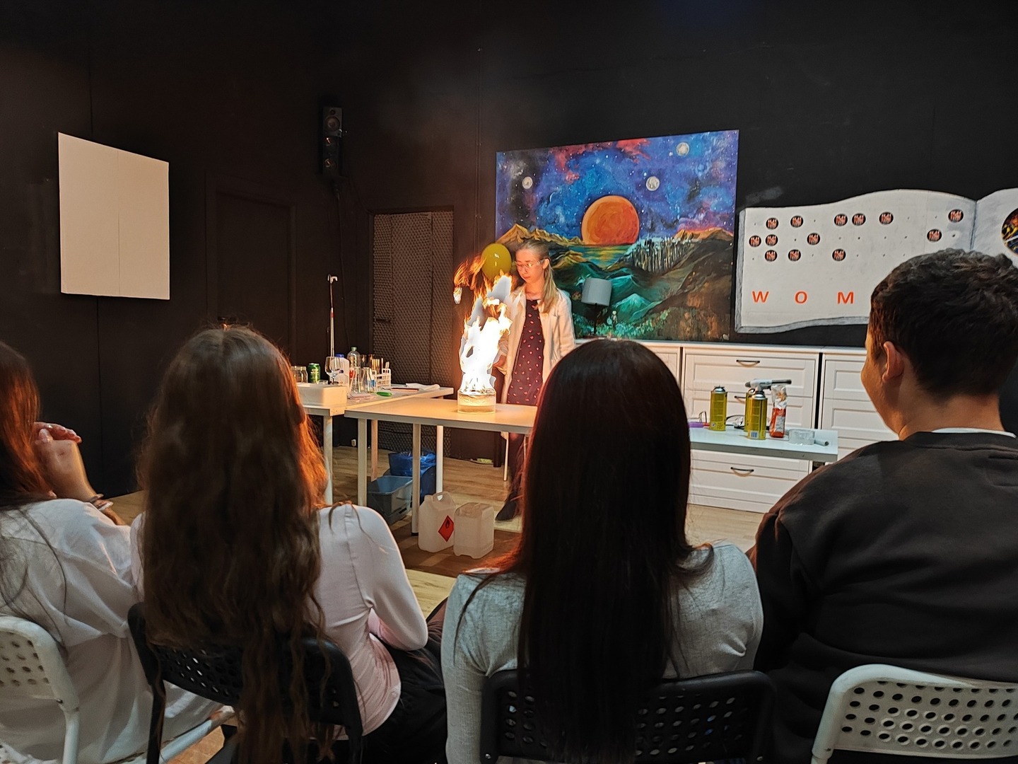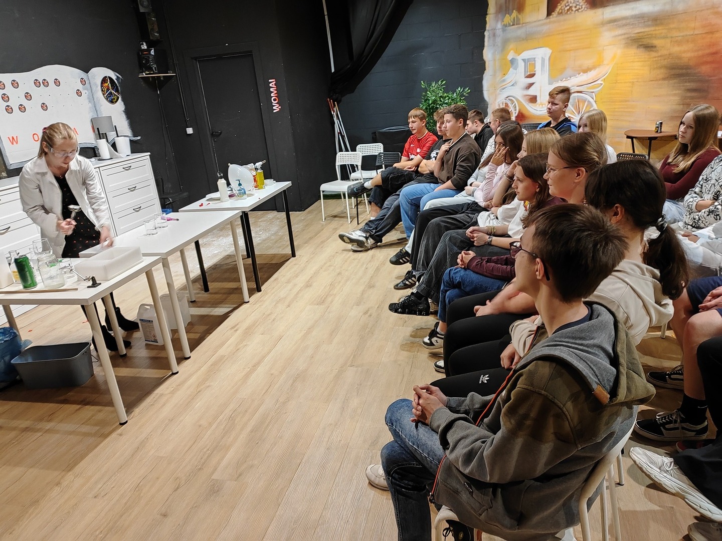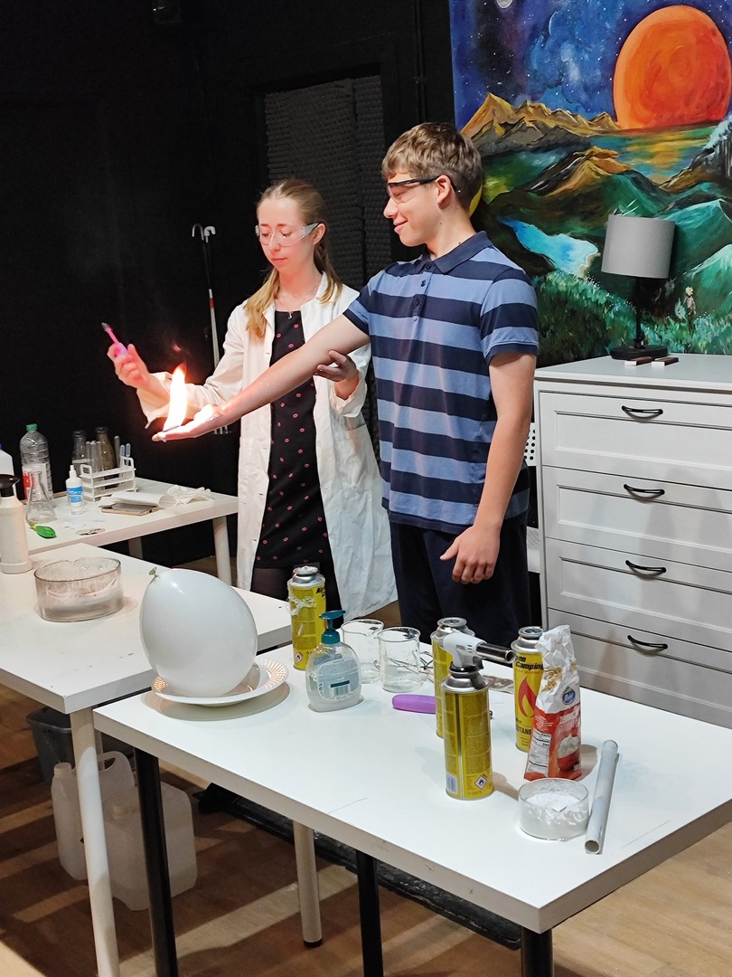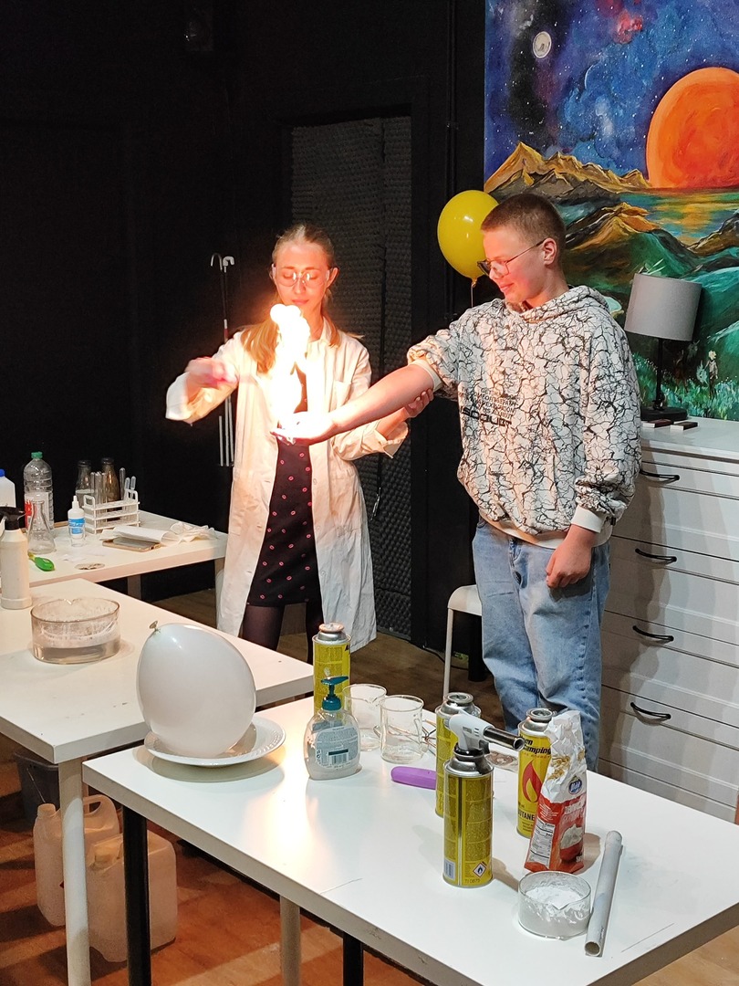 Następnym etapem była udział w „Pokazie eksperymentów”, gdzie uczniowie, pod czujnym okiem prowadzącej, wcielili się w rolę chemików. Samodzielnie wykonywali widowiskowe doświadczenia, odkrywając tajniki chemii. Najodważniejsi zdecydowali się nawet na efektowny eksperyment z podpaleniem własnej — oczywiście w pełni bezpiecznych warunkach.