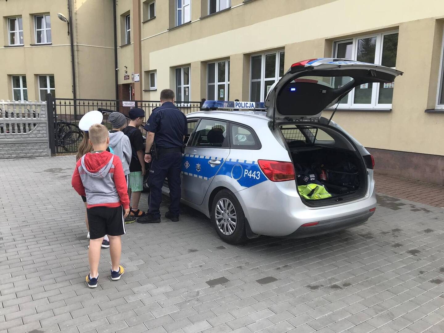 Podczas spotkania pan policjant nie tylko przypomniał uczniom najważniejsze zasady bezpieczeństwa, ale również zaprosił wszystkich do obejrzenia radiowozu policyjnego oraz wyposażenia, które towarzyszy funkcjonariuszom w codziennej pracy.