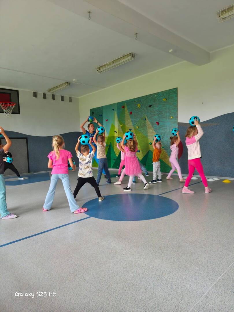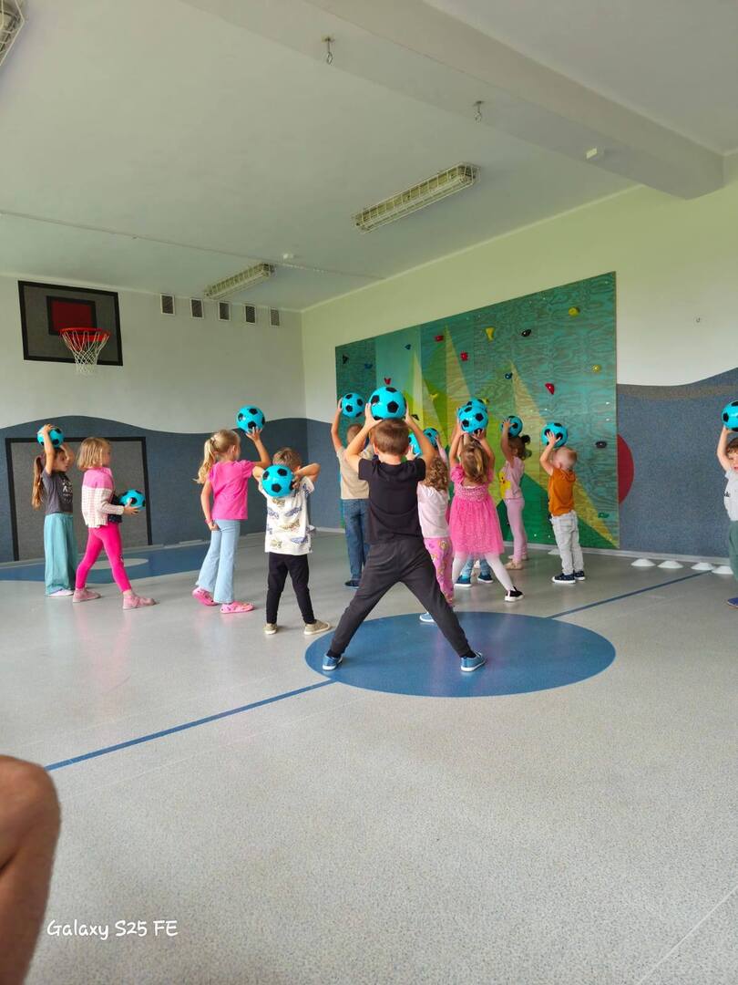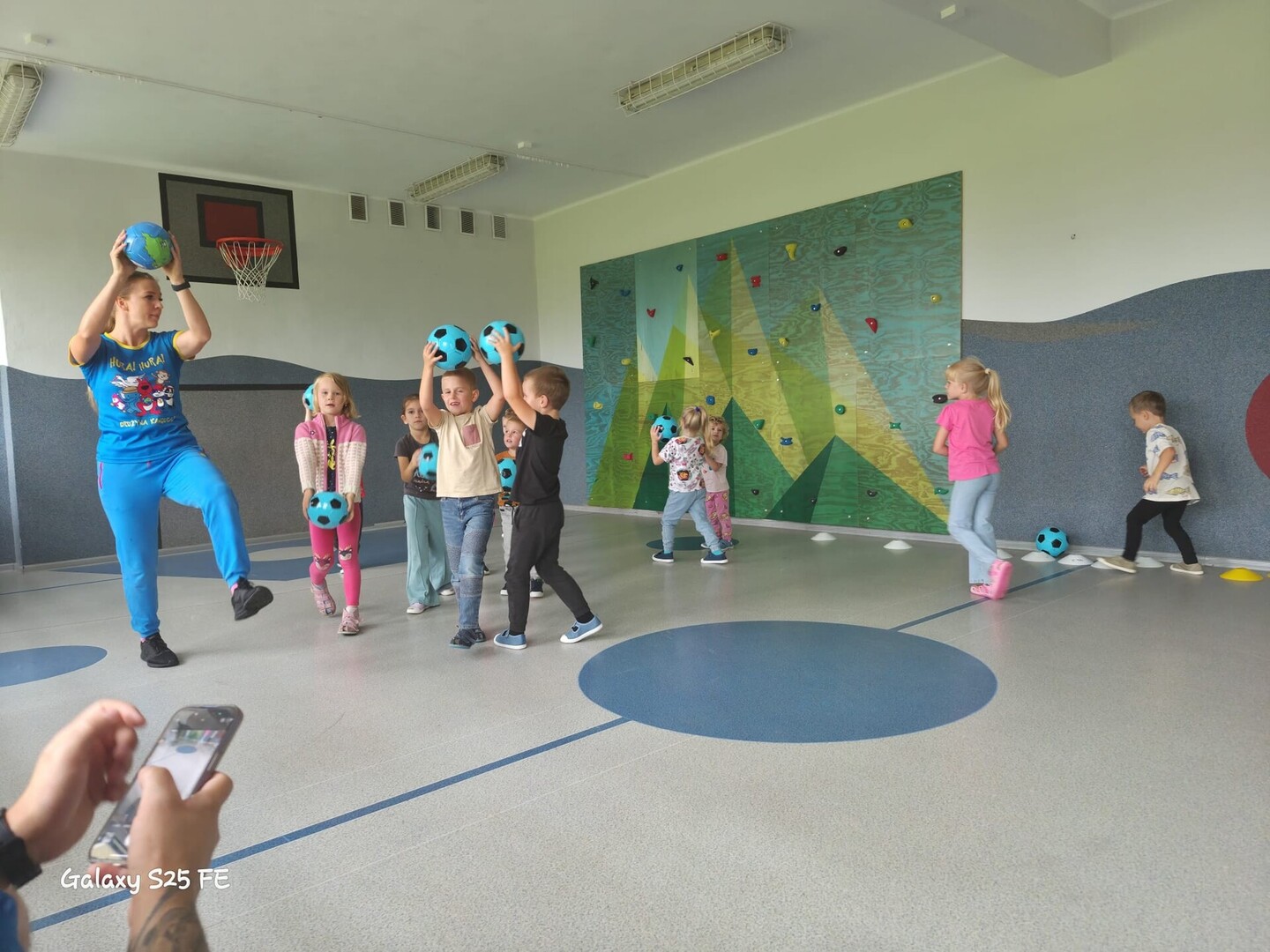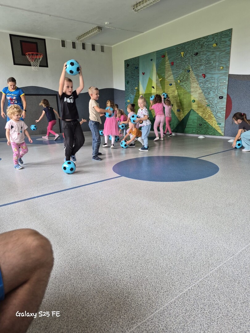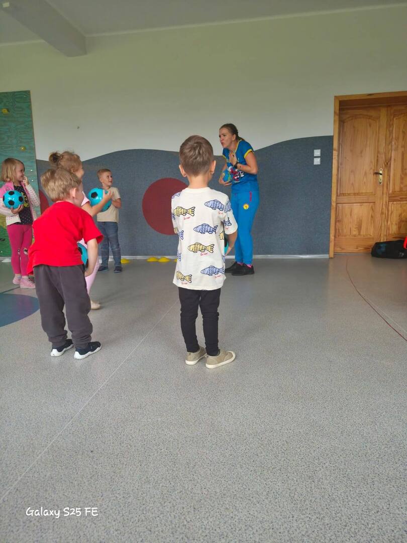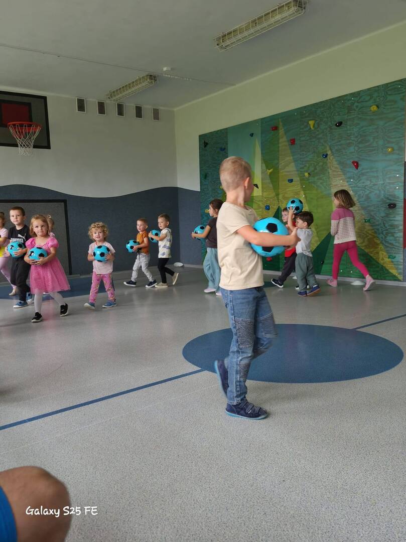 Zajęcia ogólnorozwojowe z wykorzystaniem piłki. Ruch i sport to nie tylko zdrowie i dobra zabawa, ale też świetna okazja do nawiązywania relacji z rówieśnikami. Nasze przedszkolaki podczas zajęć bawiły się świetnie.