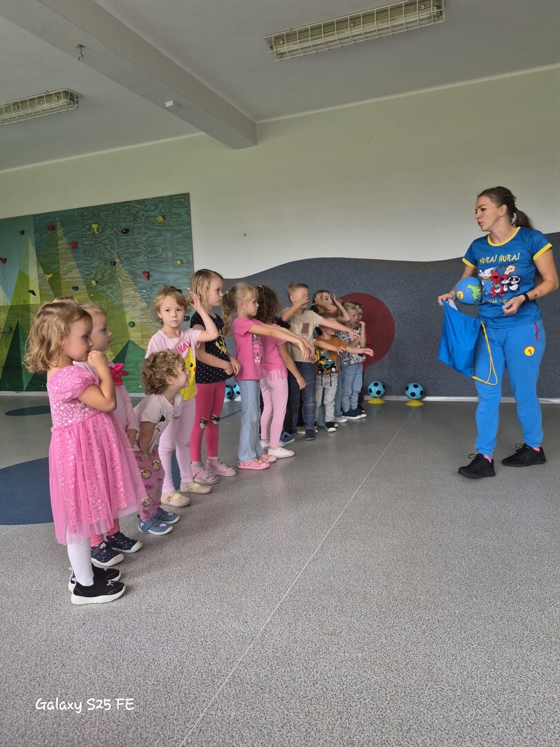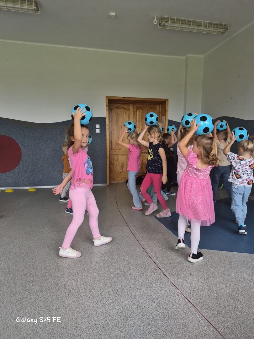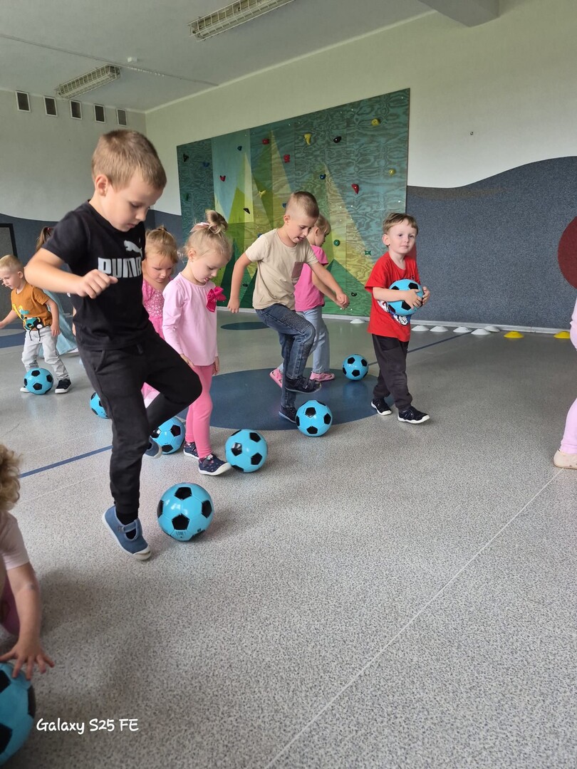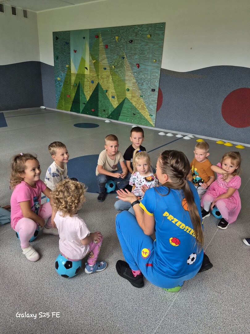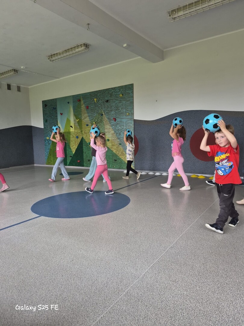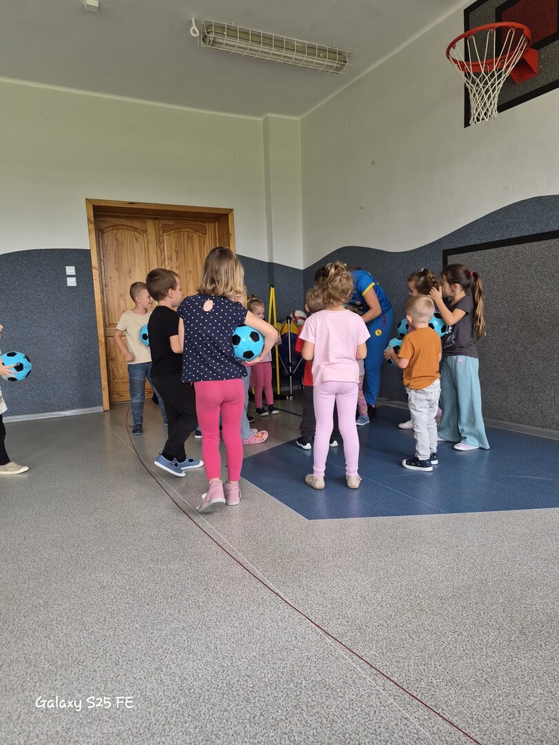 Zajęcia ogólnorozwojowe z wykorzystaniem piłki. Ruch i sport to nie tylko zdrowie i dobra zabawa, ale też świetna okazja do nawiązywania relacji z rówieśnikami. Nasze przedszkolaki podczas zajęć bawiły się świetnie.