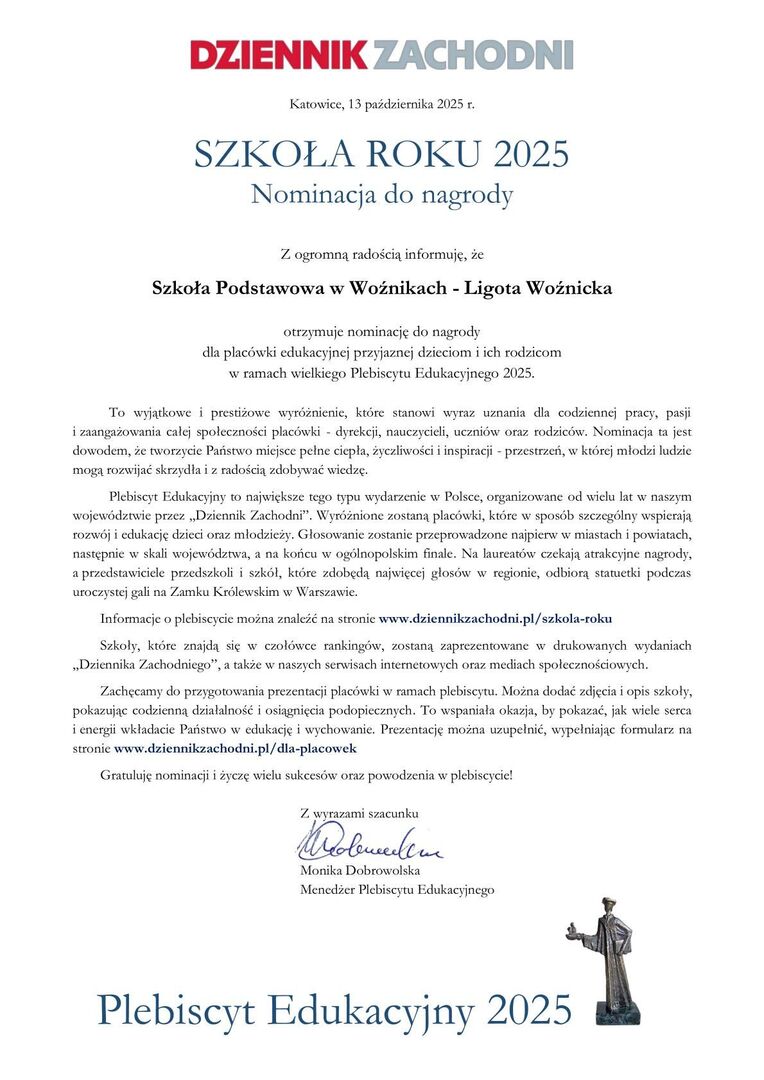 Z radością informujemy, że nasza szkoła otrzymała nominację do tytułu Szkoła Roku w Plebiscycie Edukacyjnym 2025 organizowanym przez „Dziennik Zachodni”!