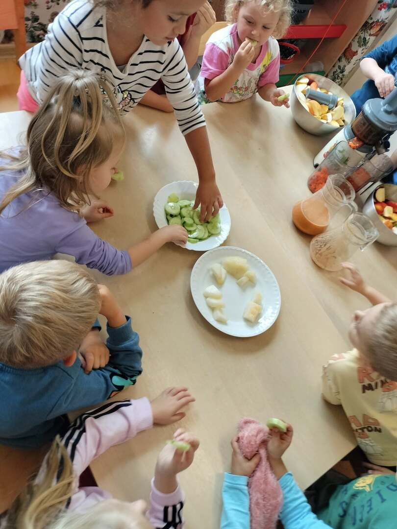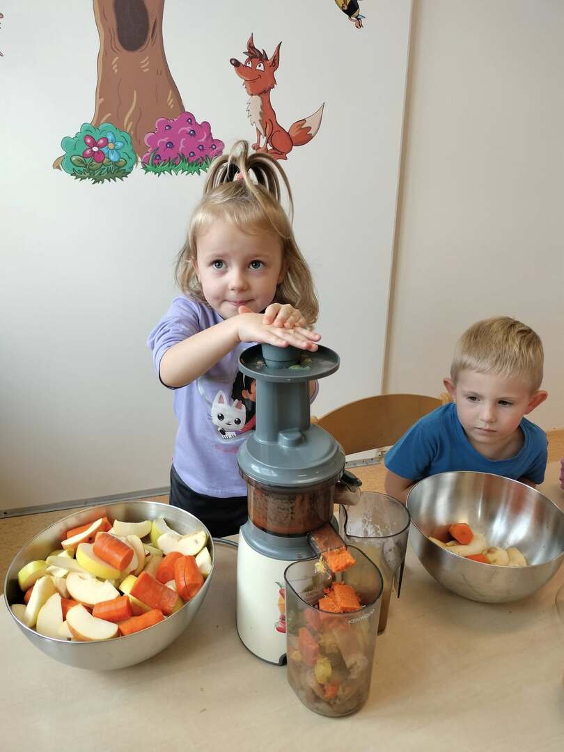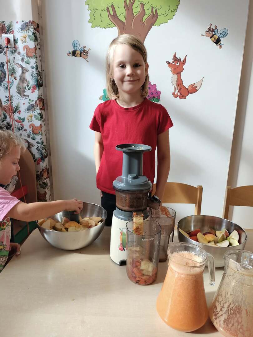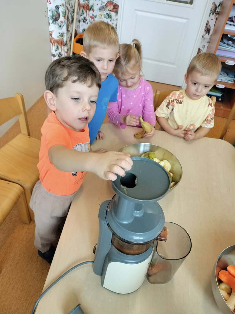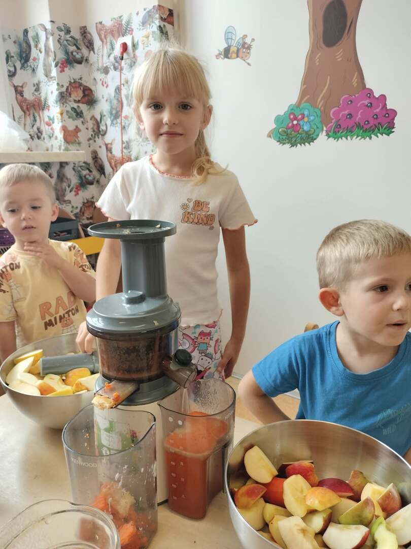 17.10.2025 r. świętowaliśmy Światowy Dzień Owoców i Warzyw! Z tej okazji dzieci przyniosły swoje ulubione owoce i warzywa, z których wspólnie przygotowaliśmy pyszny, kolorowy sok owocowo-warzywny. Było dużo radości, mieszania, smakowania i odkrywania nowych smaków!