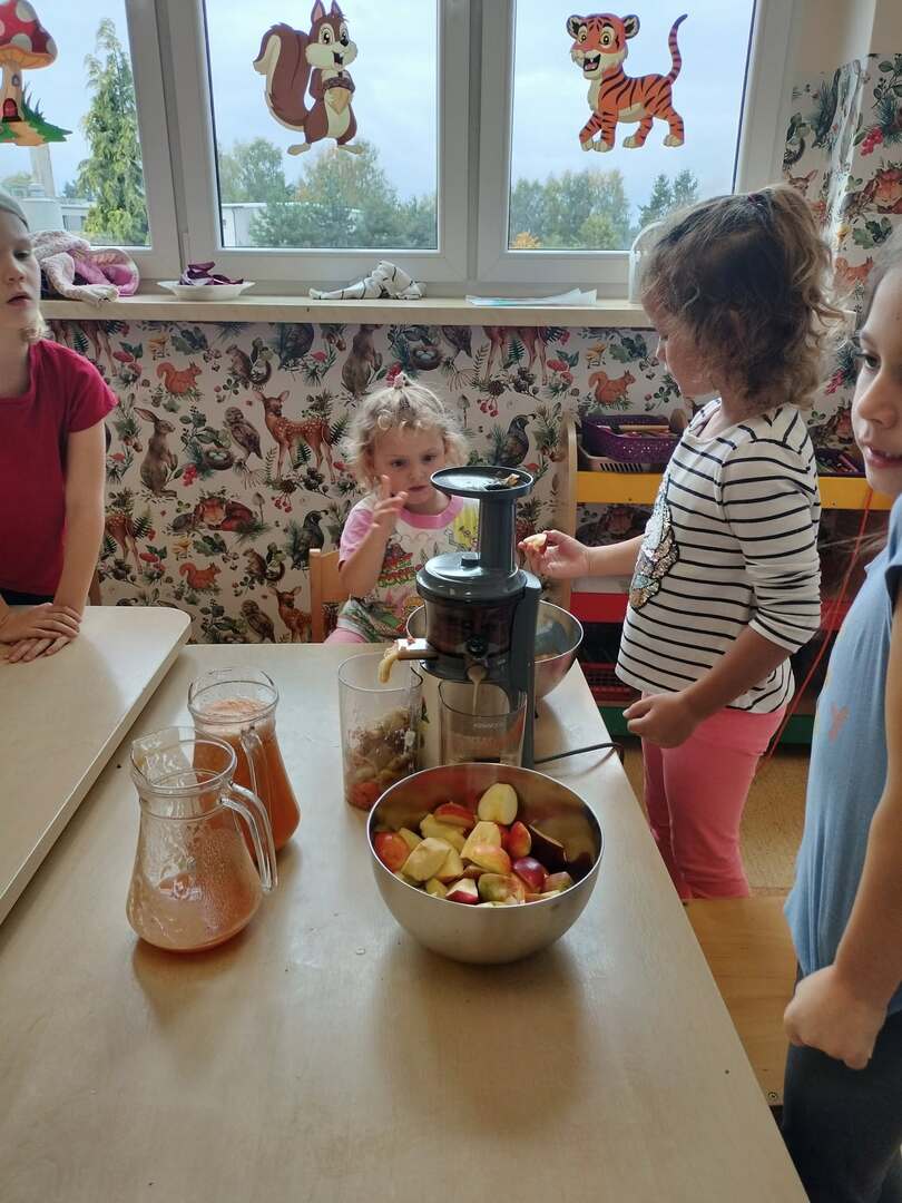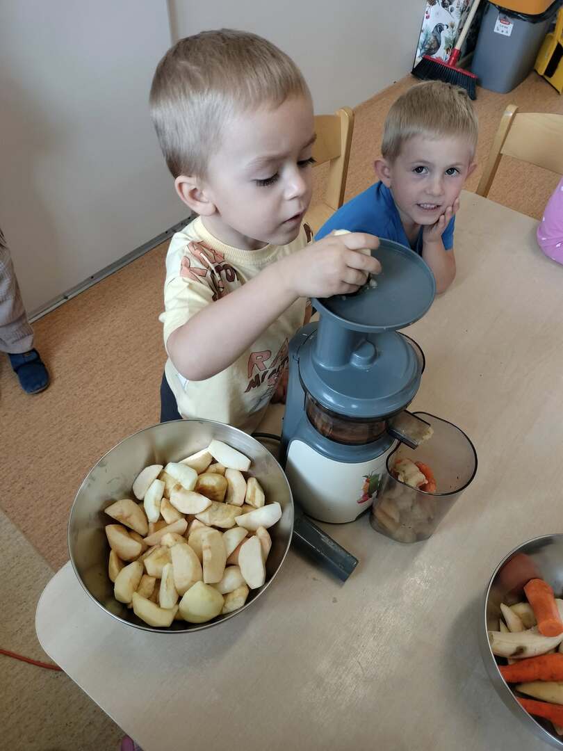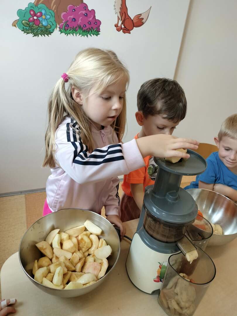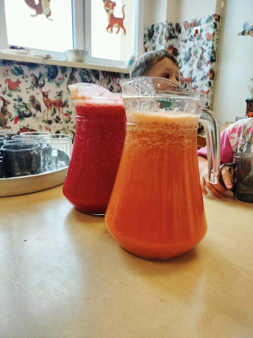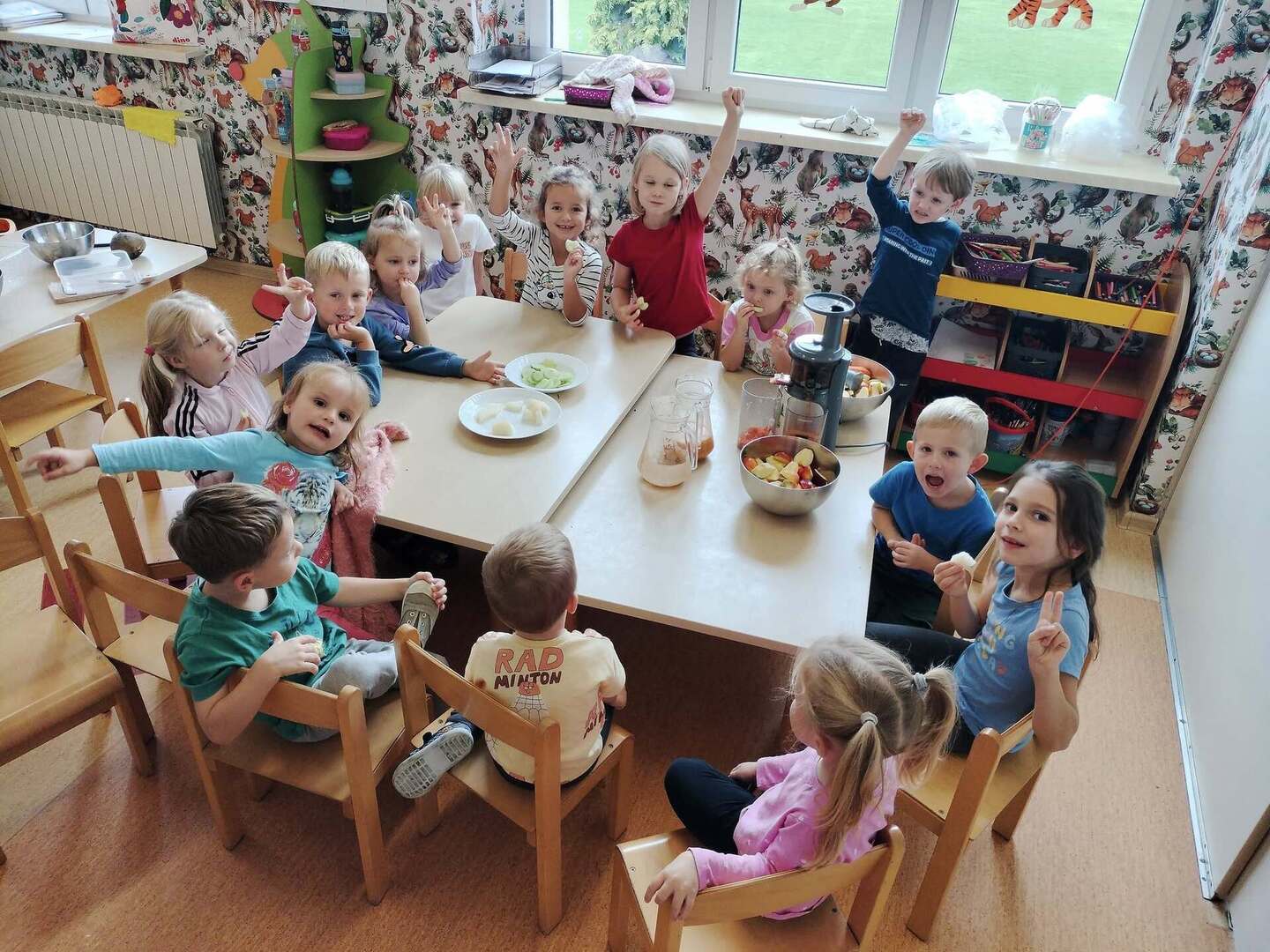 17.10.2025 r. świętowaliśmy Światowy Dzień Owoców i Warzyw! Z tej okazji dzieci przyniosły swoje ulubione owoce i warzywa, z których wspólnie przygotowaliśmy pyszny, kolorowy sok owocowo-warzywny. Było dużo radości, mieszania, smakowania i odkrywania nowych smaków!